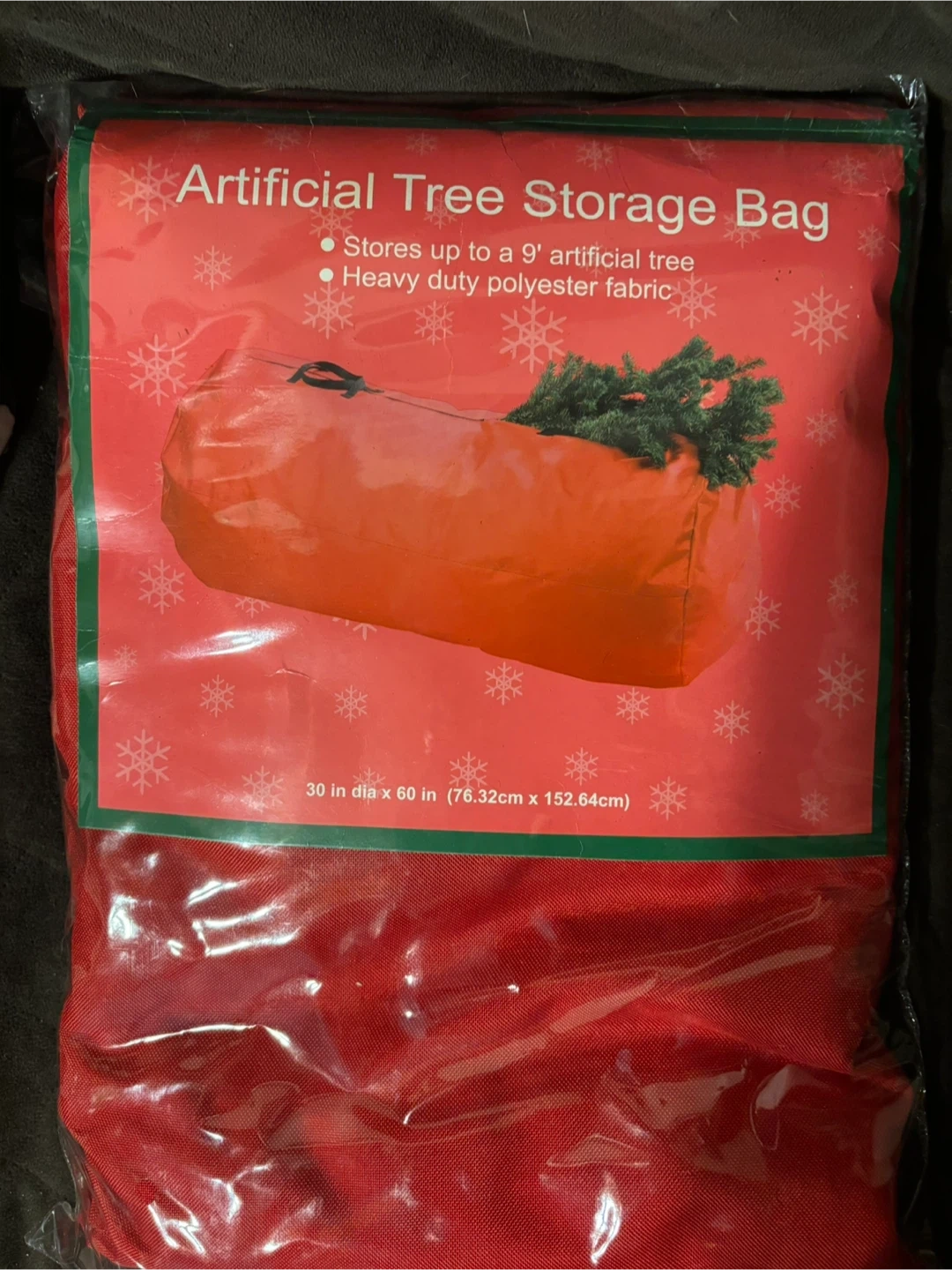 15Artificial tree storage bag from Bed Bath & Beyond! It stores up to a 9' artificial tree and is made of heavy-duty polyester fabric. The bag measures 30 inches in diameter x 60 inches (76.32cm x 152.64cm).