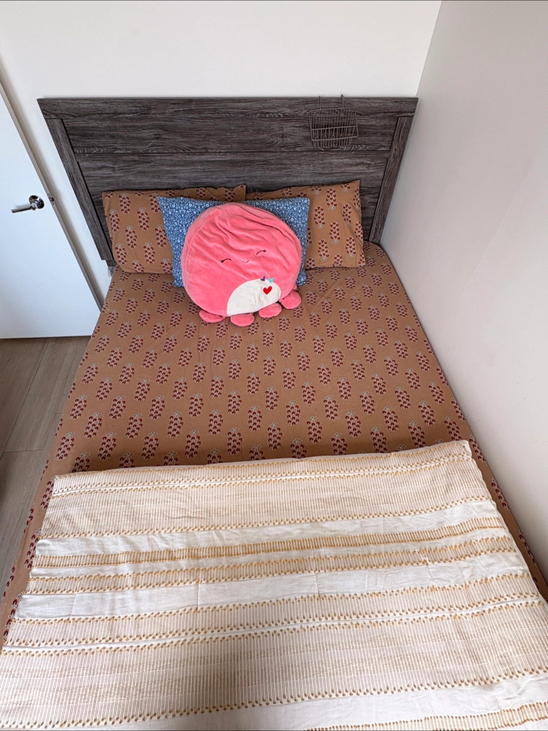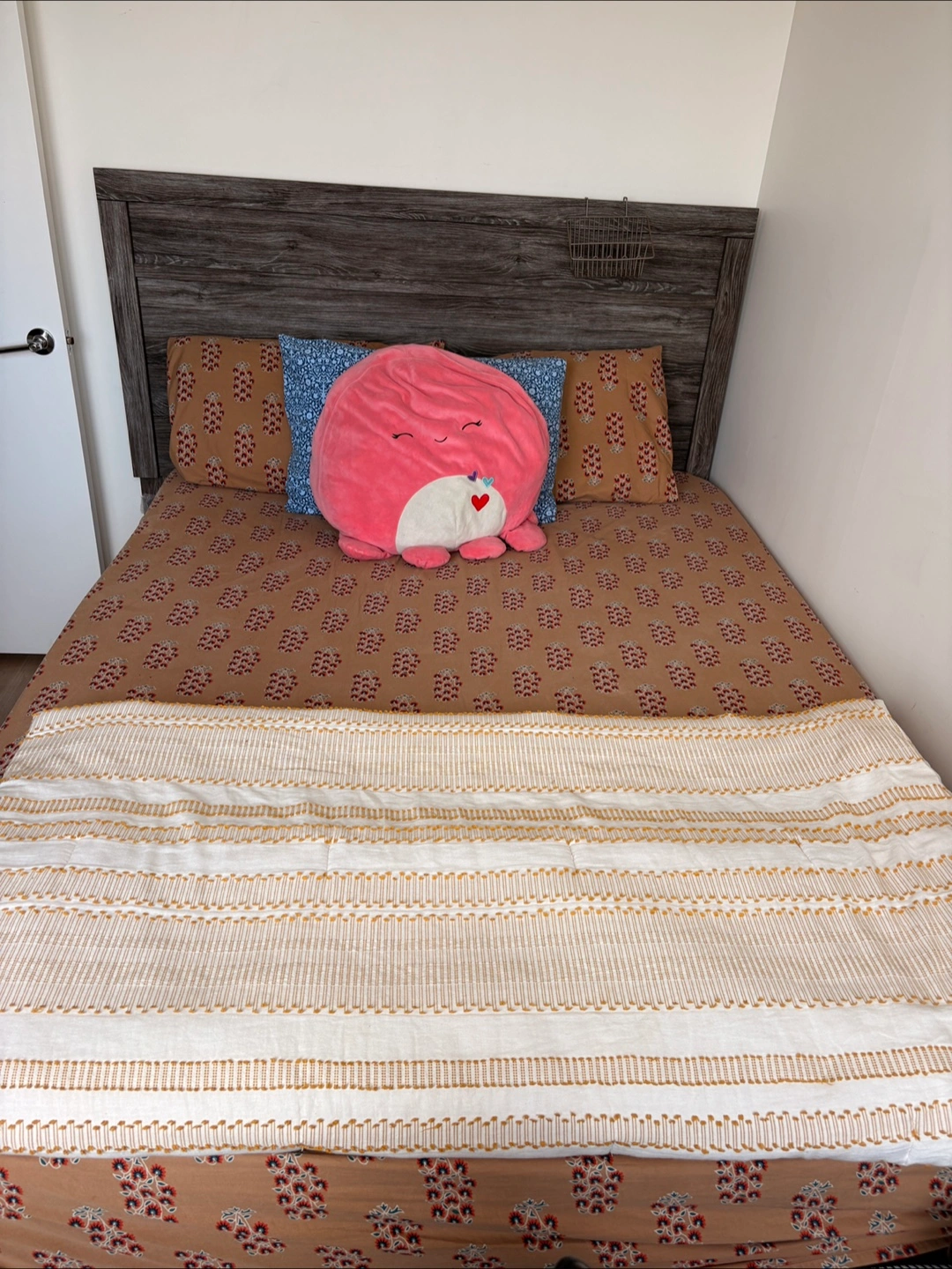 Full size bed with headboard, approximately 55” wide × 77” long. Modern dark gray wooden frame, sturdy construction, and well maintained. Neutral design that works with any decor. Mattress included.