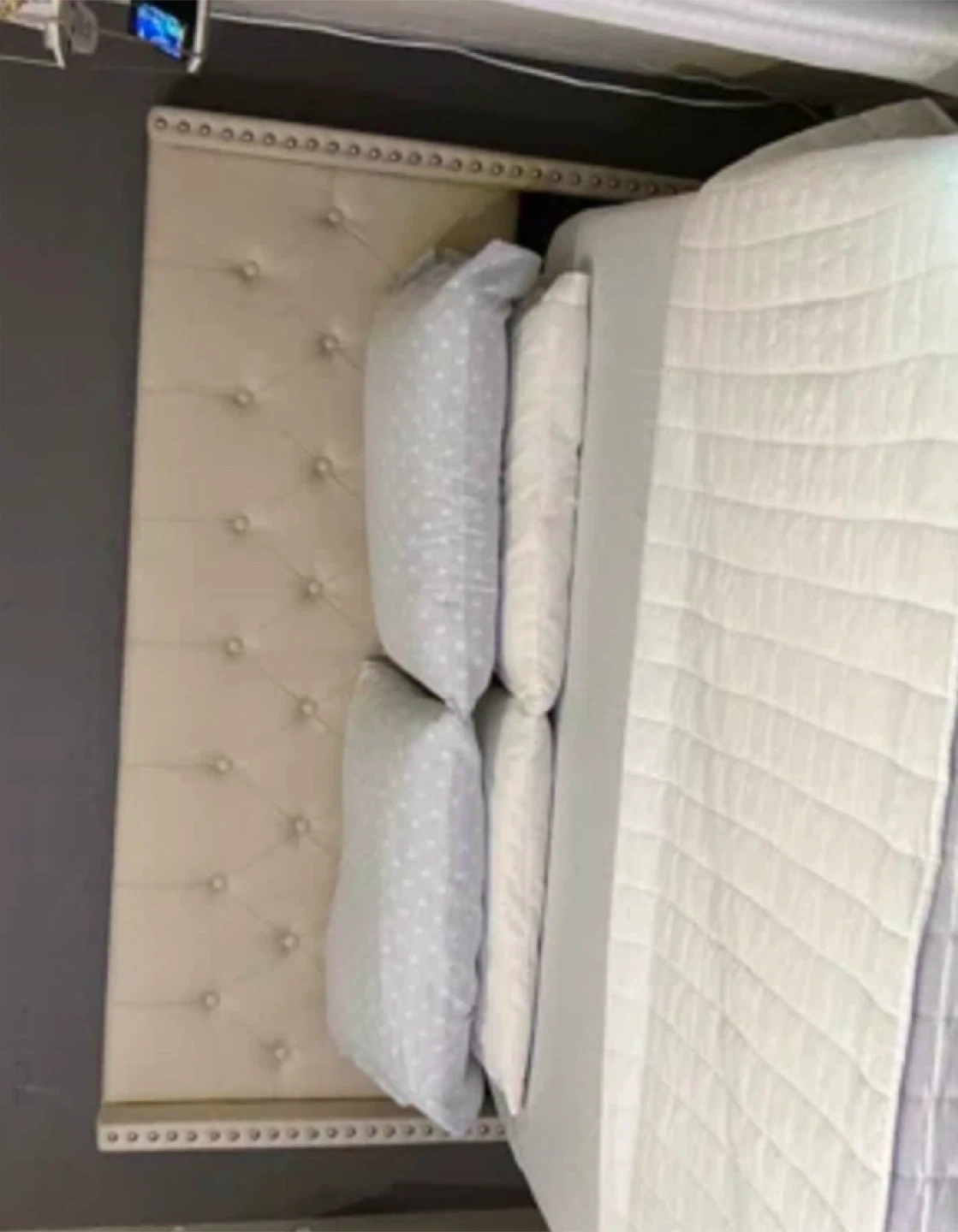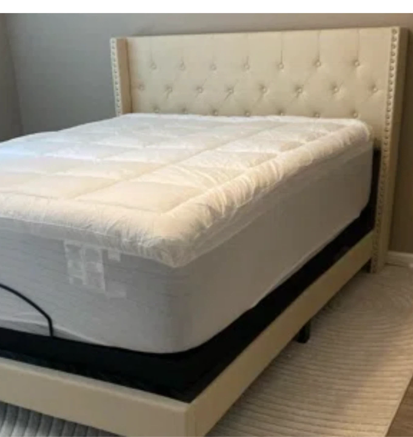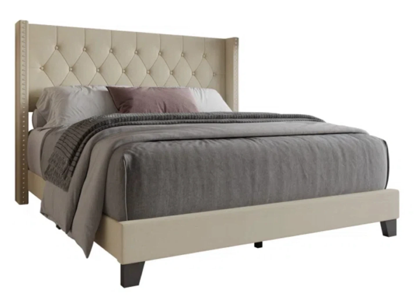 Selling a stylish upholstered queen bed frame! It features a tufted headboard with elegant nailhead trim. The color is beige (neutral off white), perfect for any bedroom decor. It's in good condition and ready for a new home! Mattress can be sold separately for 400$ (its hybrid ikea matress)