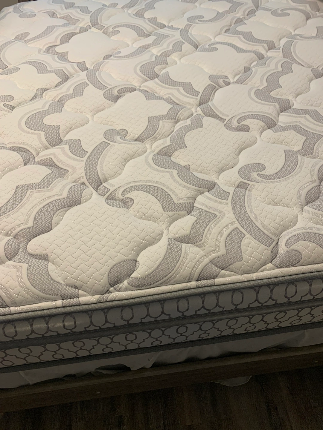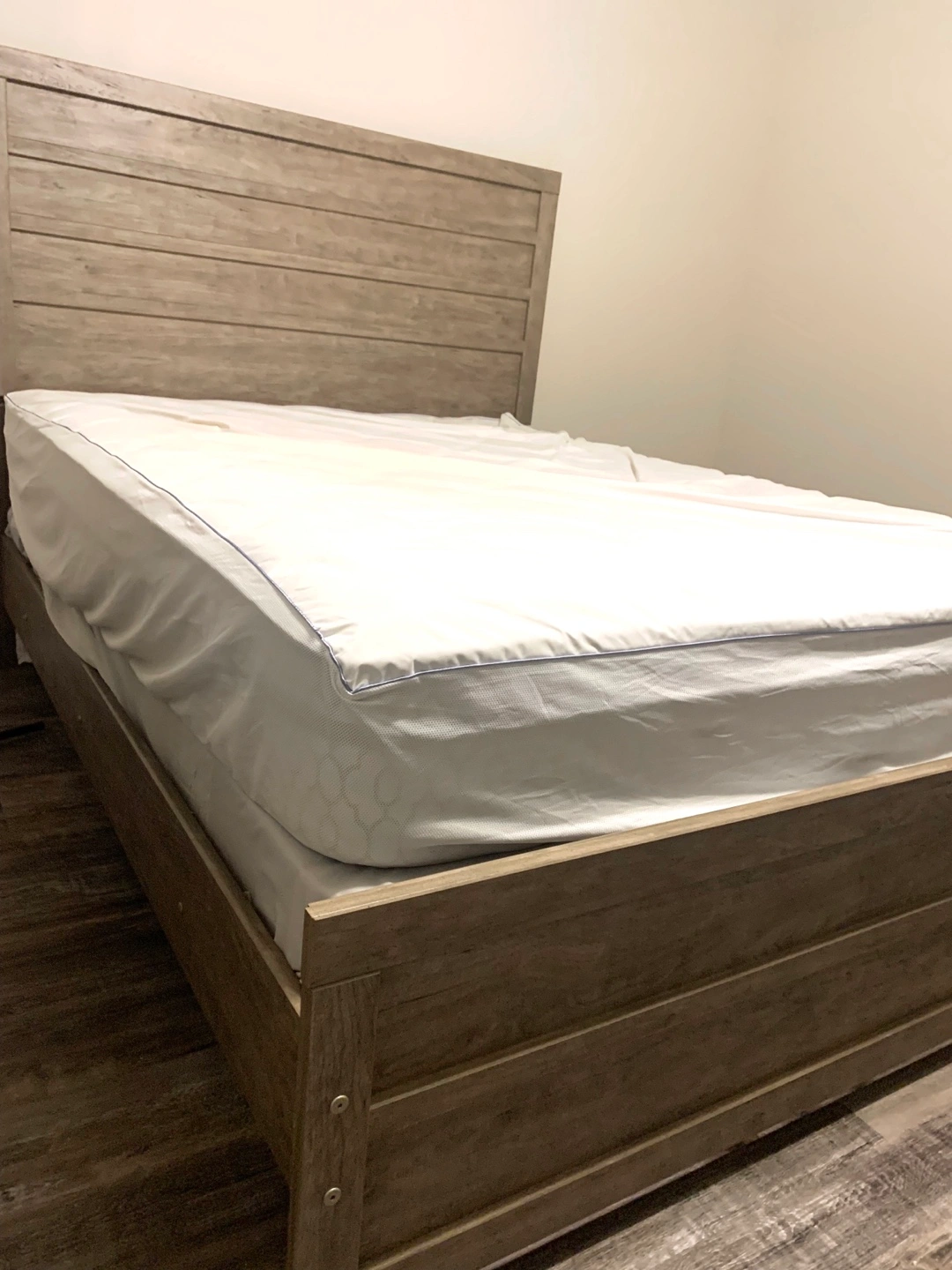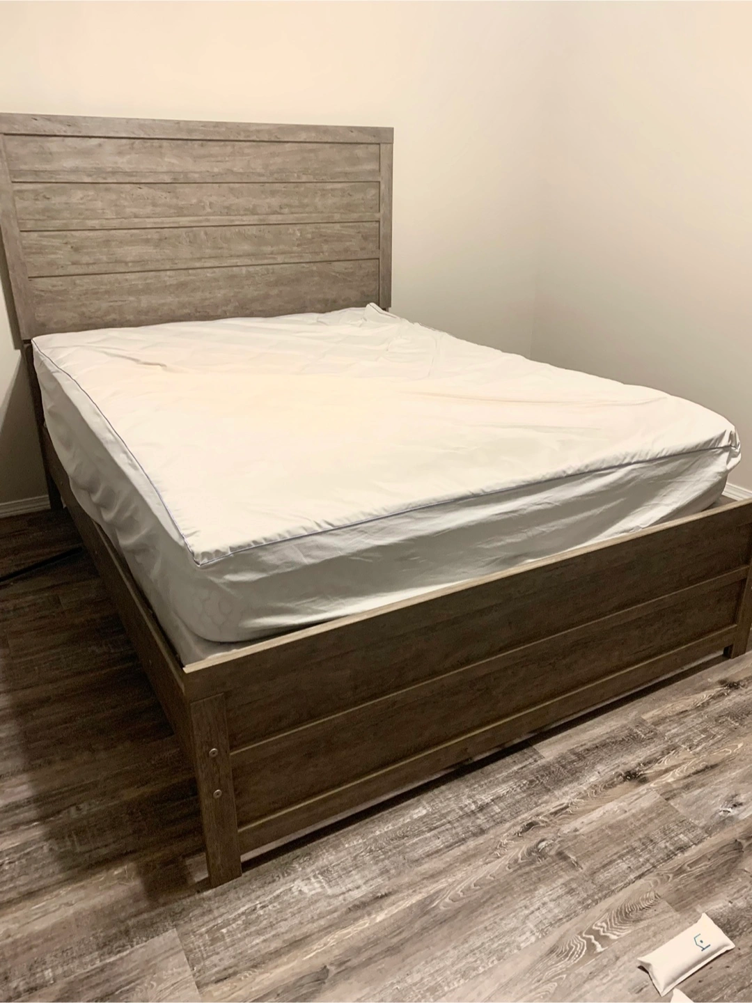 Queen size mattress and box spring set. Gray wood frame headboard and footboard (all one unit). Elegant gray and white patterned mattress cover. Used but in good condition.