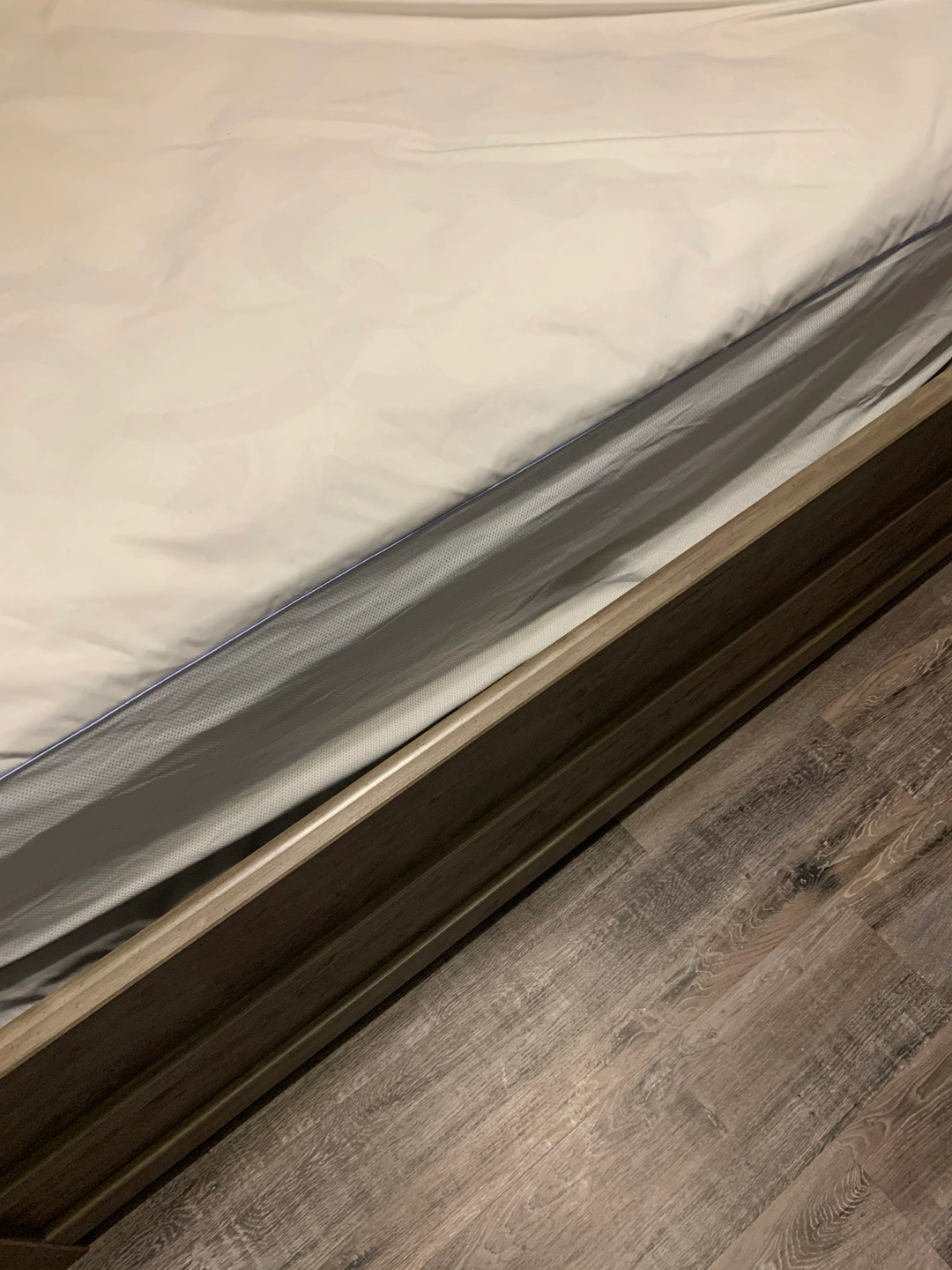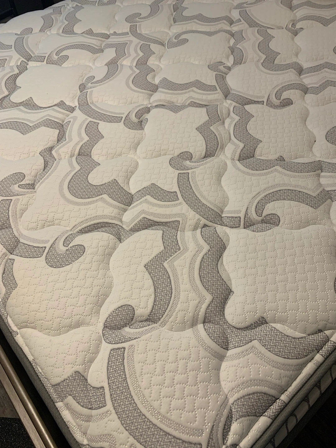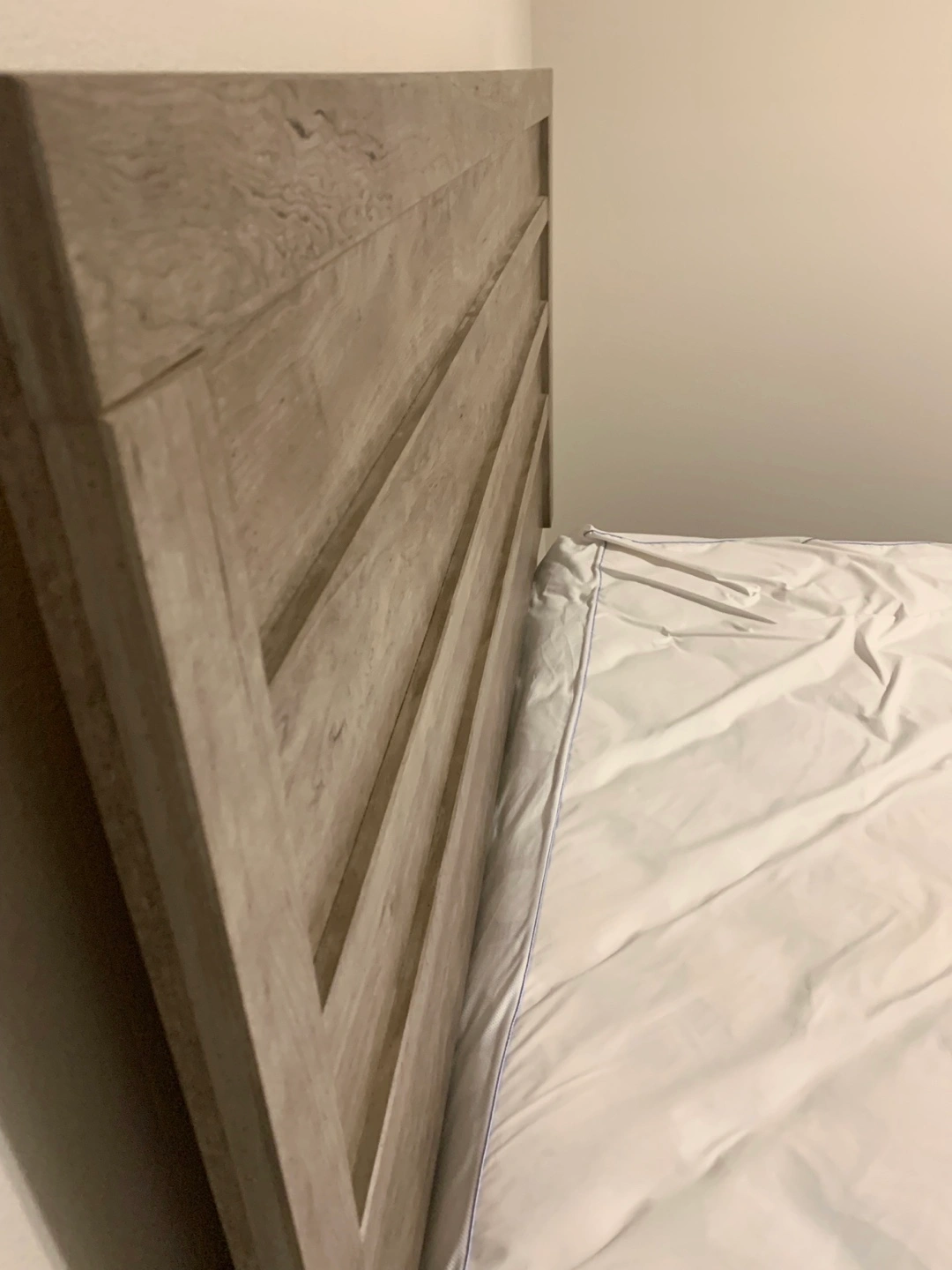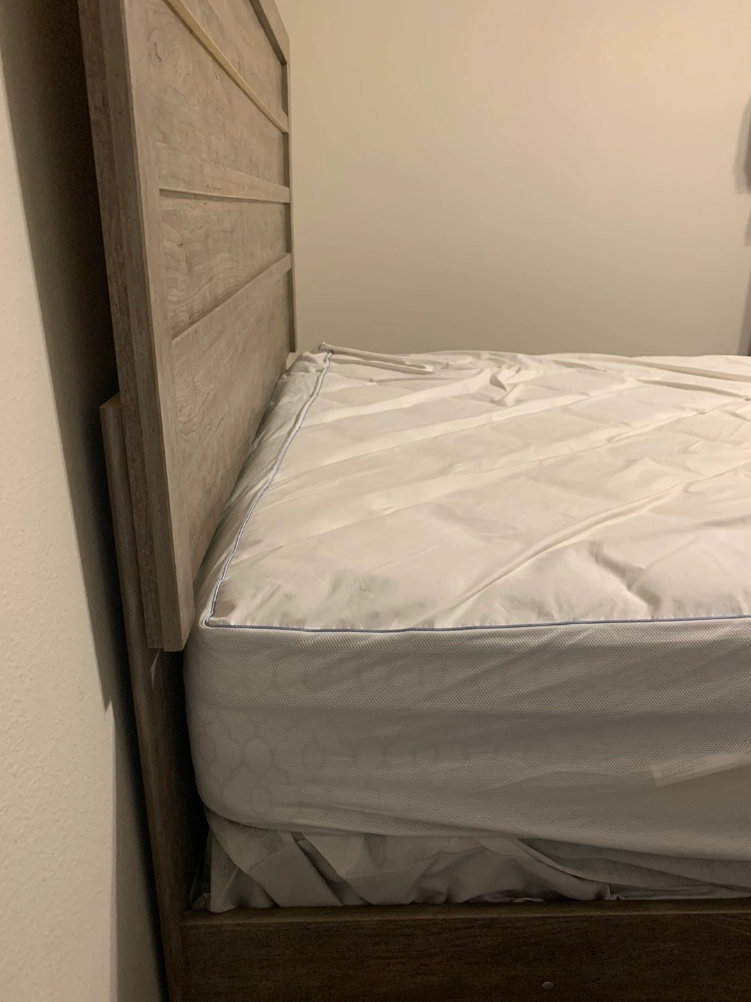 Queen size mattress and box spring set. Gray wood frame headboard and footboard (all one unit). Elegant gray and white patterned mattress cover. Used but in good condition.