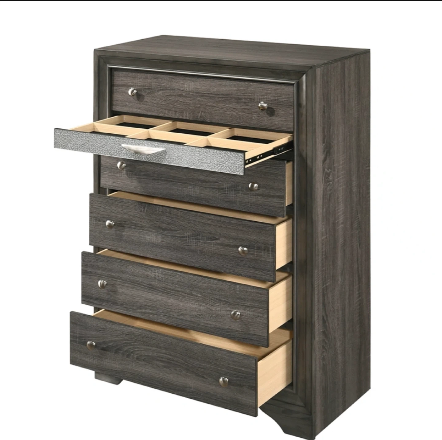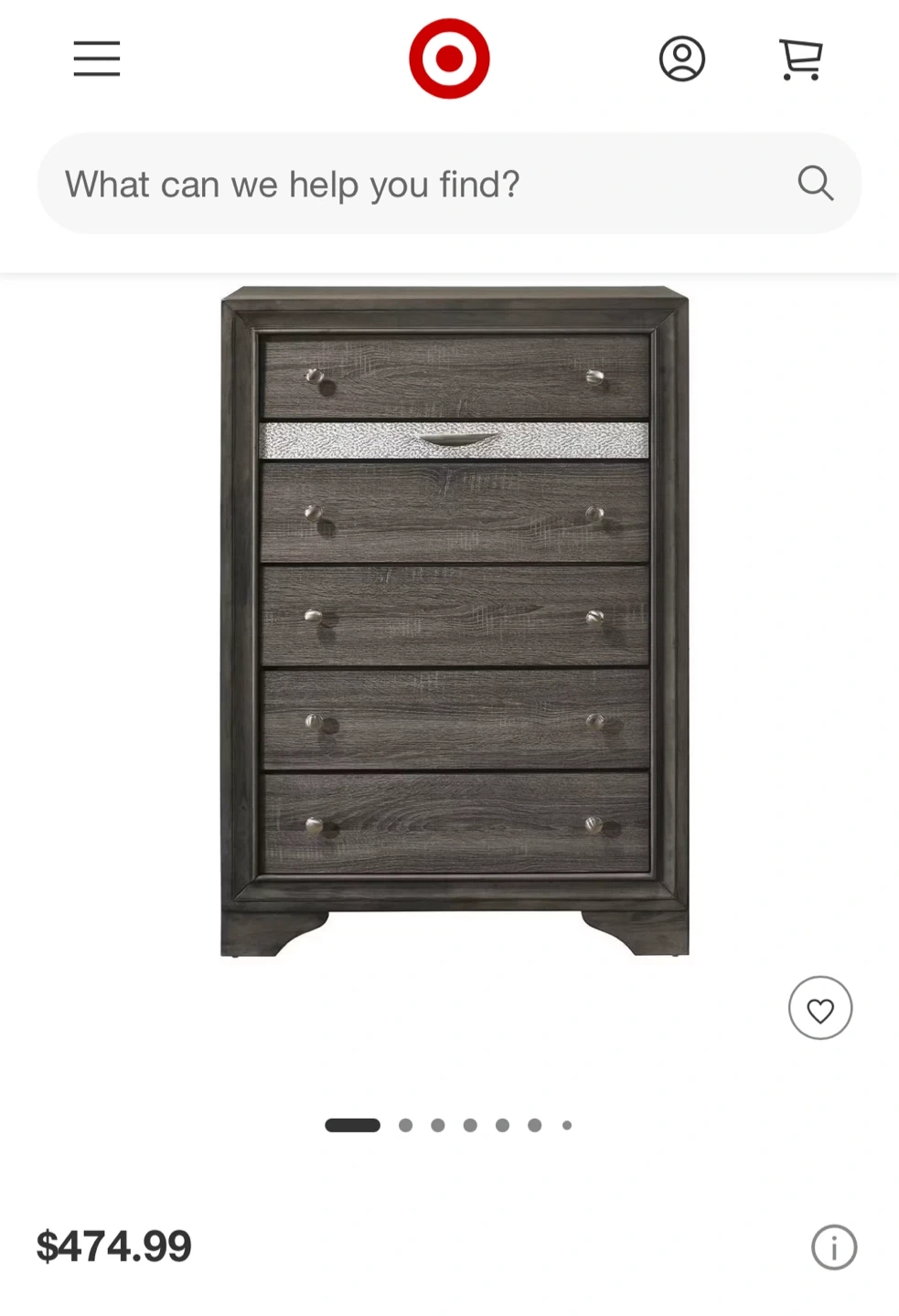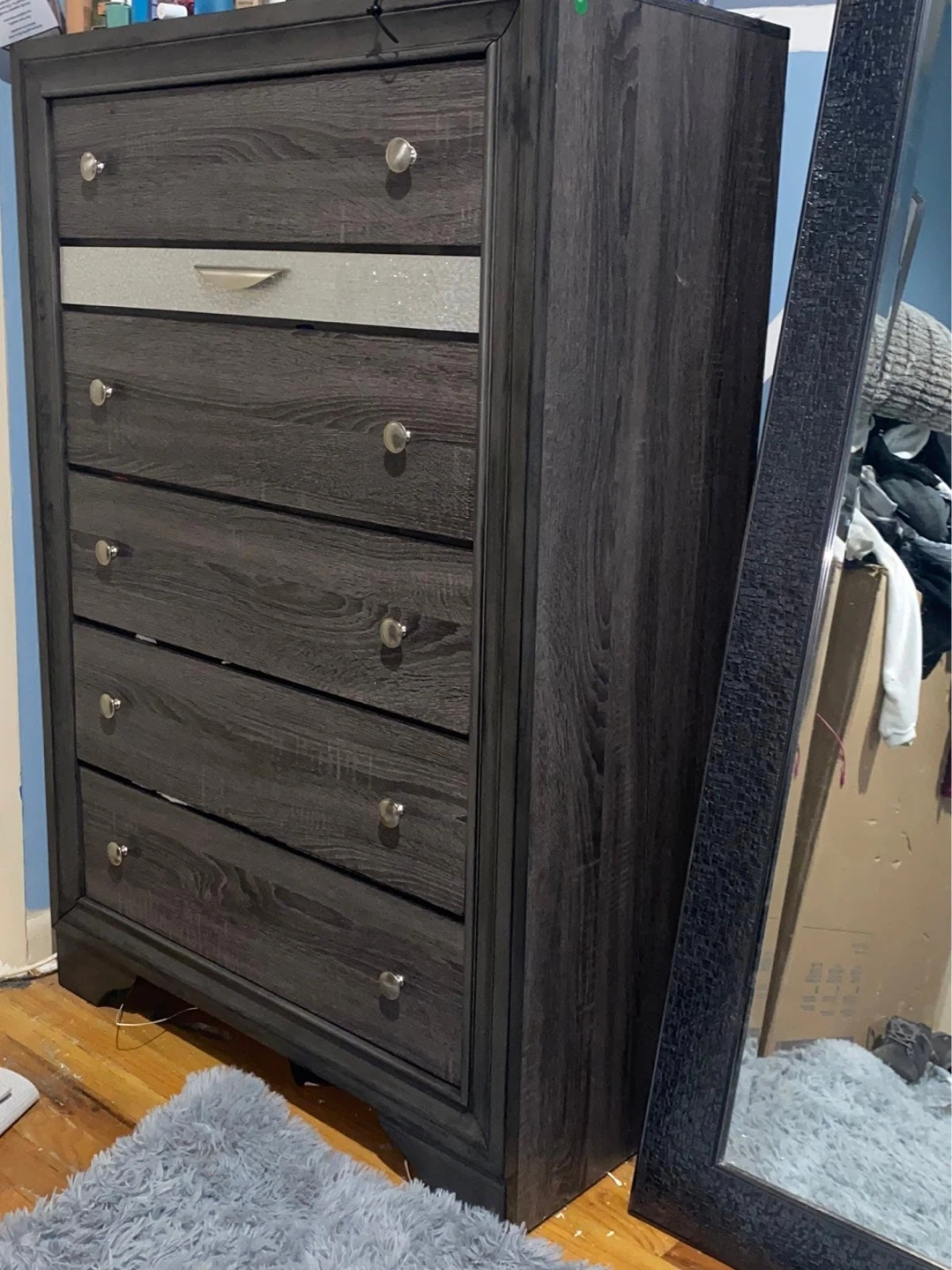 10This is a chest of drawers with a gray wood finish. It has a unique design with a silver accent drawer. Originally bought for $474.99 Please come pick it up, I will help load if necessary
