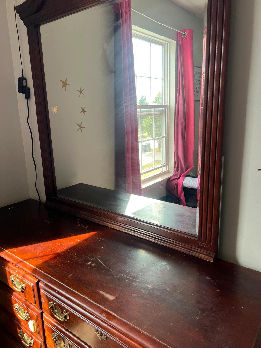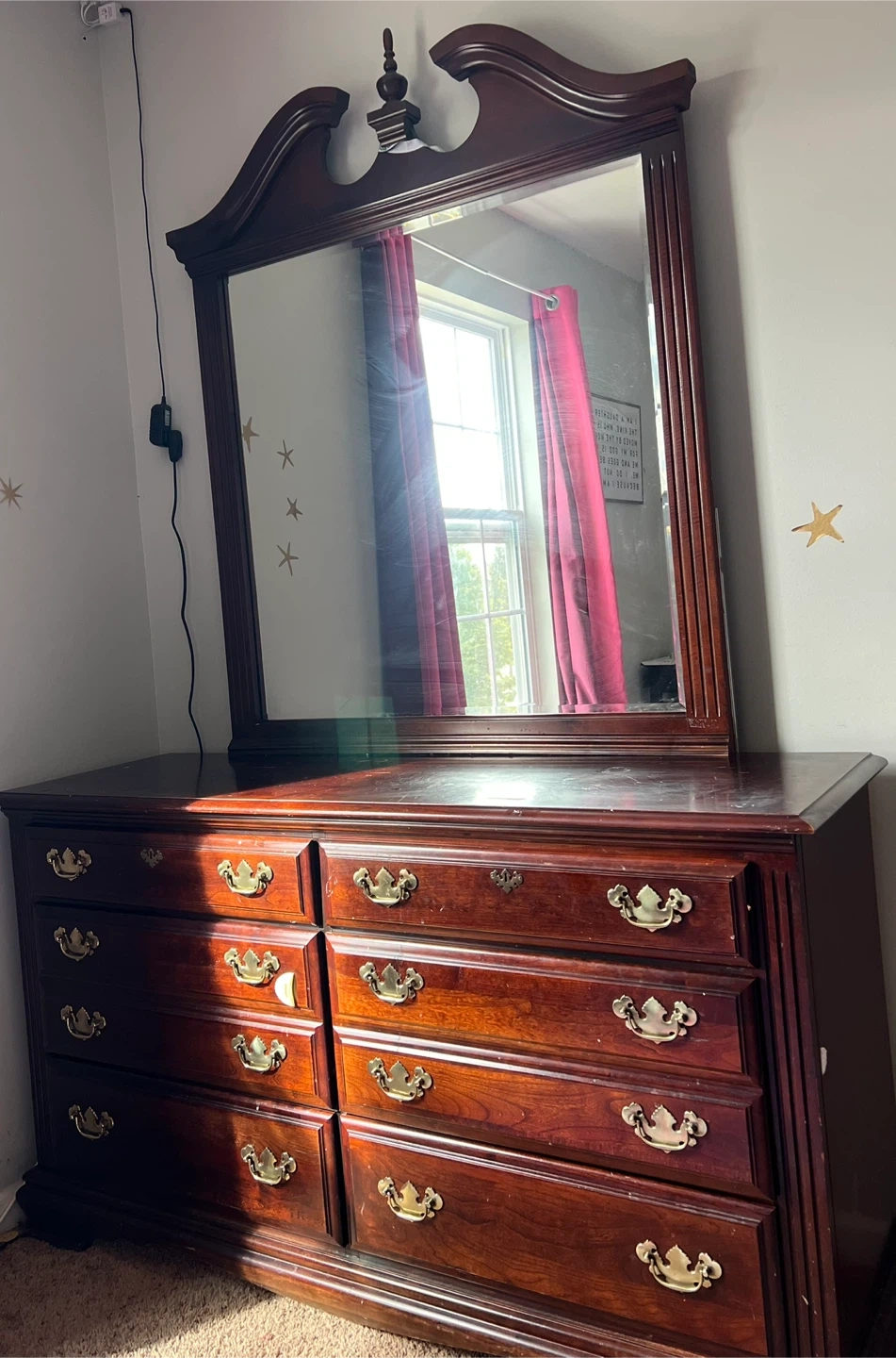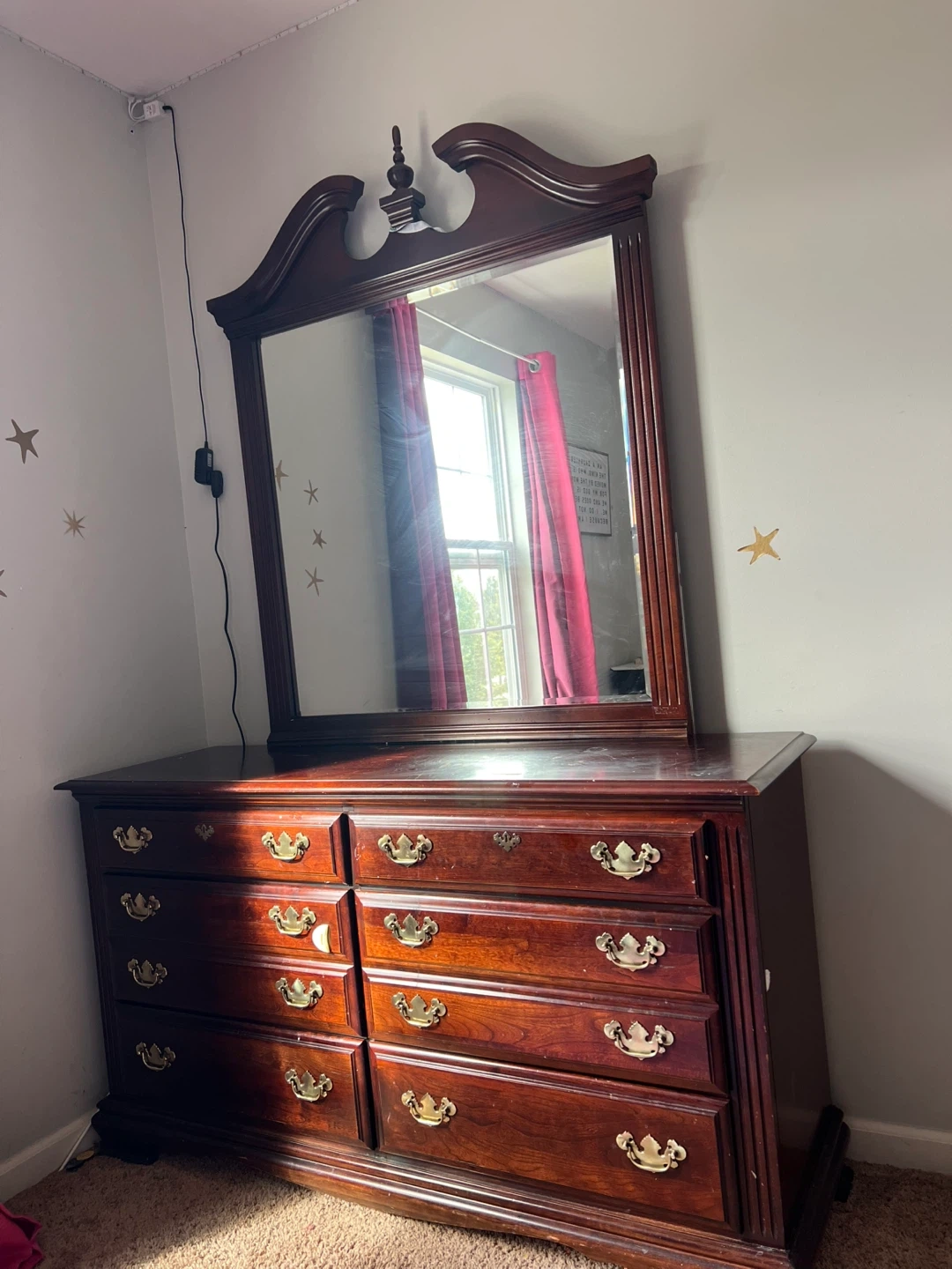 Selling a bedroom dresser with a mirror and a nightstand. Both are in good condition and have a classic look. Perfect for adding storage and style to your bedroom!
