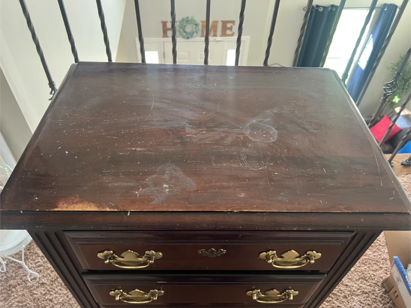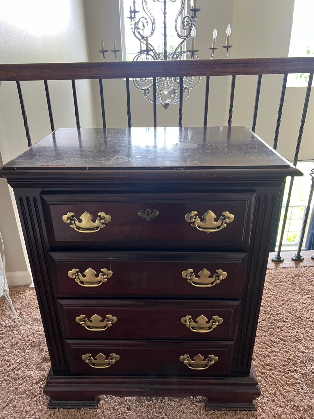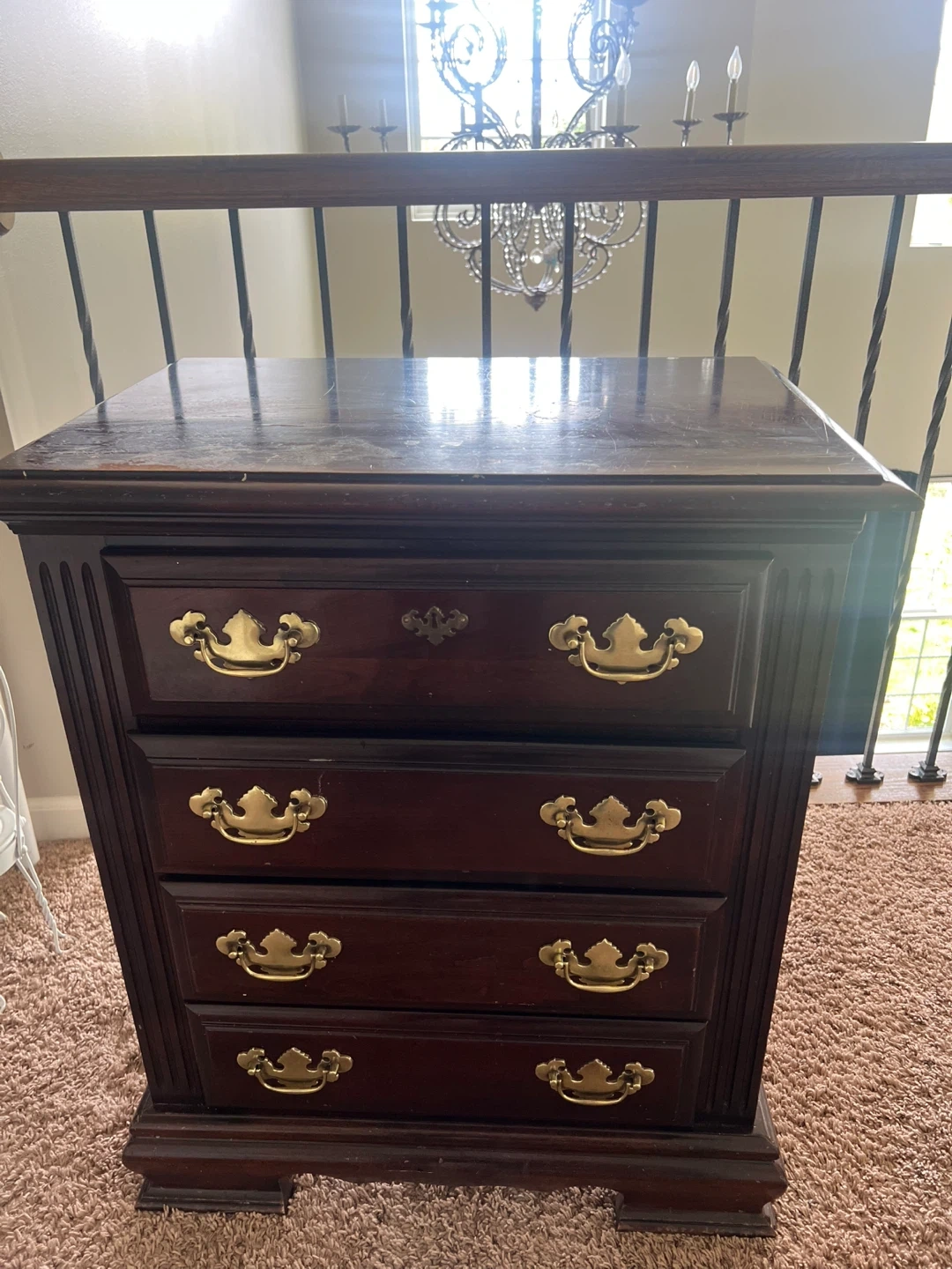 Selling a bedroom dresser with a mirror and a nightstand. Both are in good condition and have a classic look. Perfect for adding storage and style to your bedroom!