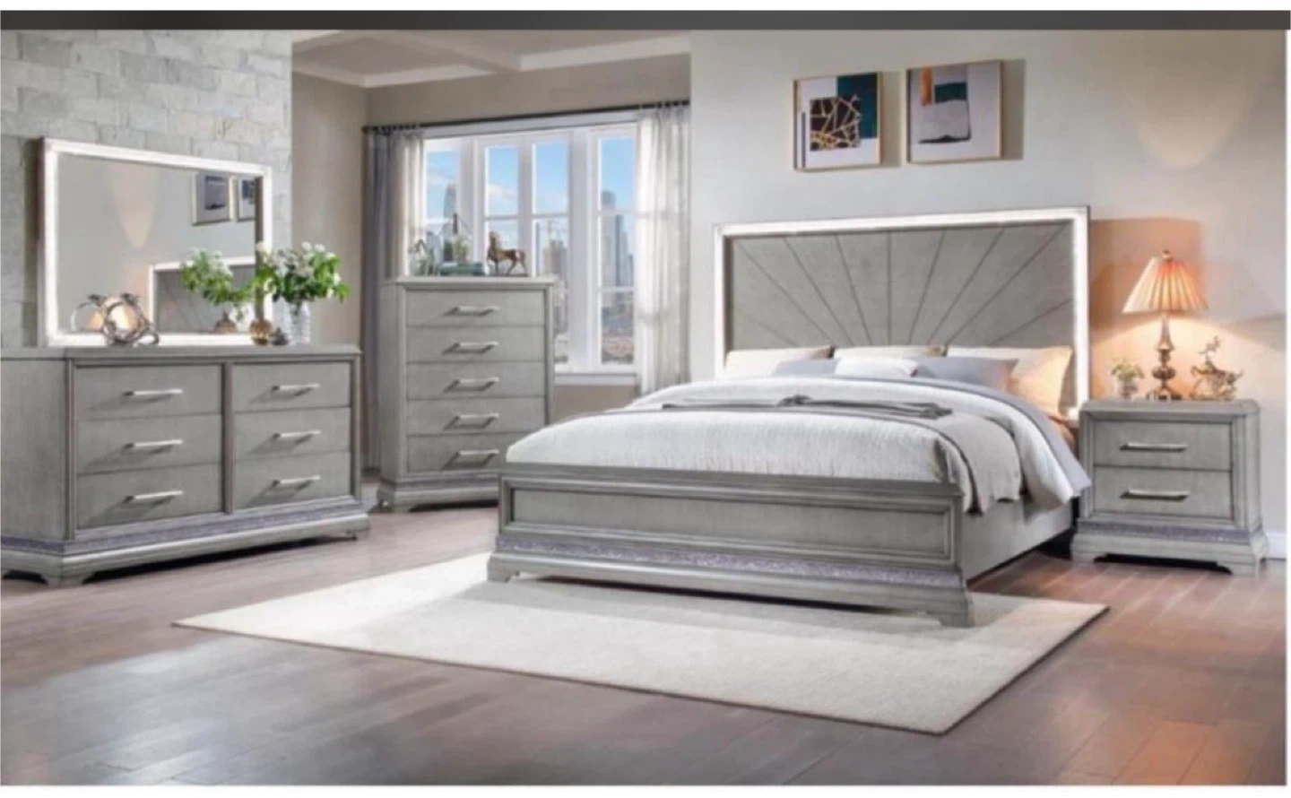 Complete bedroom set in good condition! Includes a bed, dresser, chest of drawers, nightstand, and mirror. The set features a gray finish with silver accents. Perfect to furnish your bedroom!