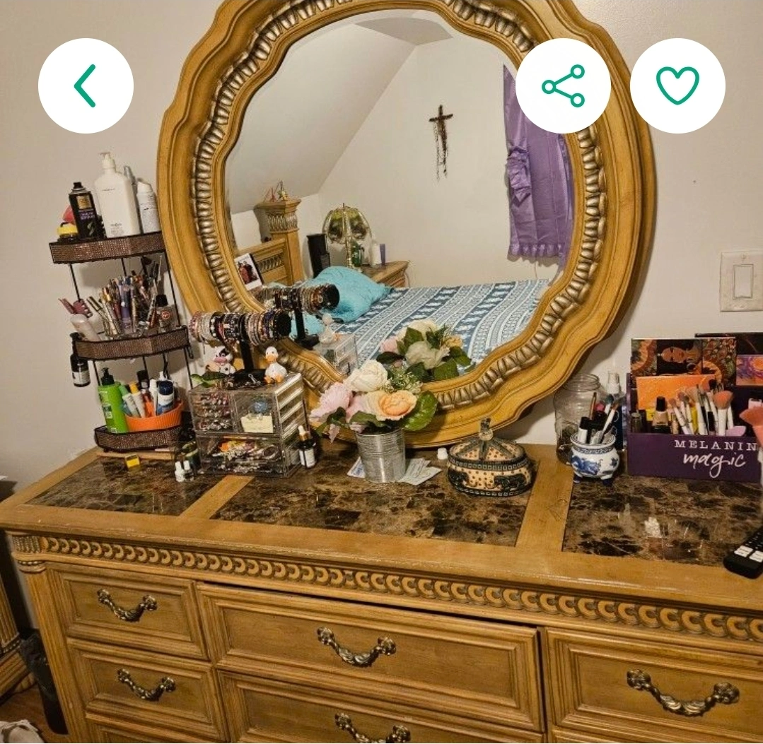 Selling a complete bedroom set! Includes a bed frame, dresser, nightstand, and armoire. All pieces have a matching ornate design and are in good condition. Perfect for furnishing a guest room or updating your own space