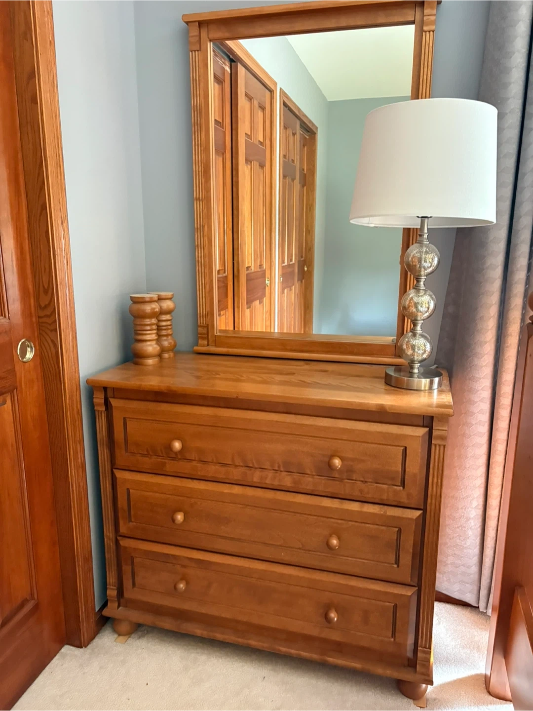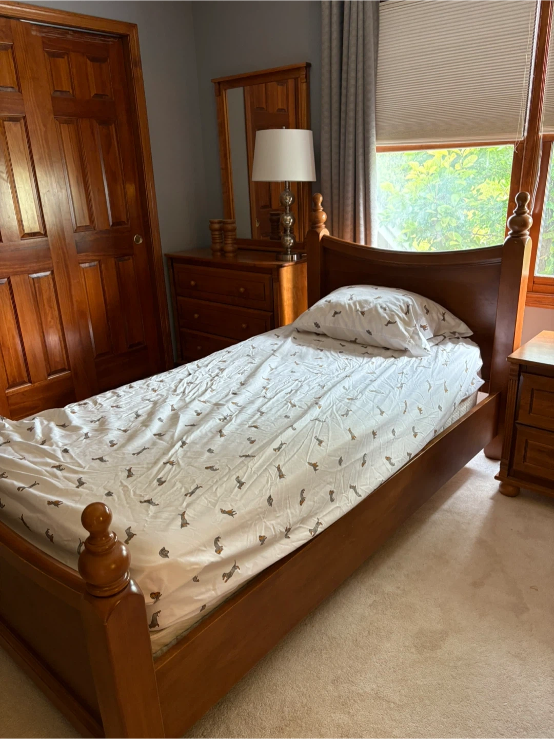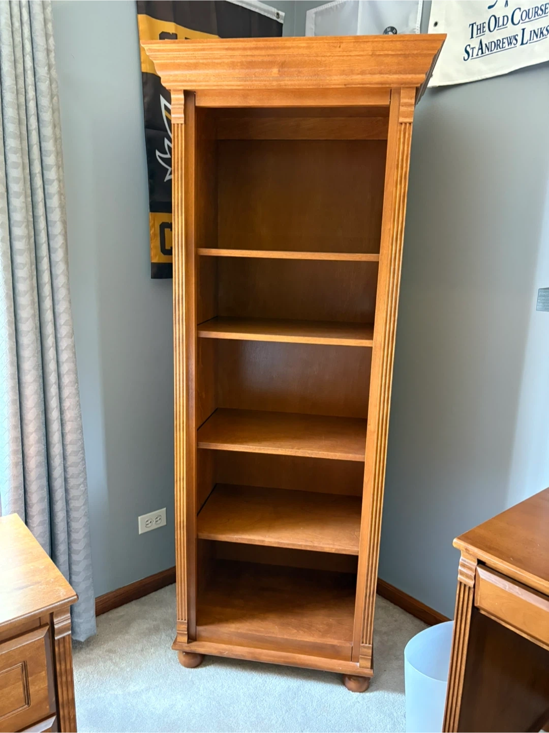 10I'm selling a complete bedroom set! It includes a dresser, a mirror, a bookcase, a bed frame, and a nightstand. All pieces are made of wood and are in great condition. Perfect for furnishing a bedroom with a matching set!