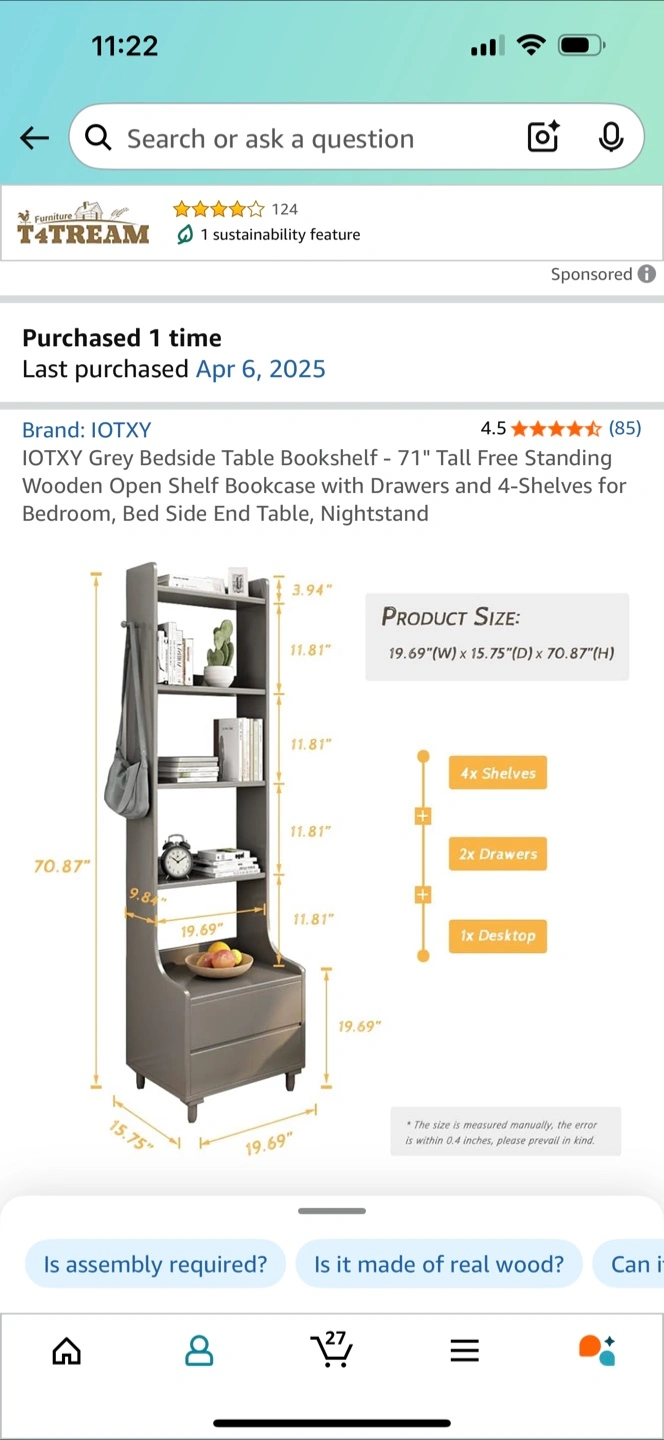 Selling a grey bedside table bookshelf. It's 71 inches tall and has a wooden open shelf bookcase design with drawers and 4 shelves. Perfect for a bedroom, bedside end table, or nightstand. Product Size: - 19.69"(W) x 15.75"(D) x 70.87"(H) Actual photo will be sent privately. 3 months old furniture.