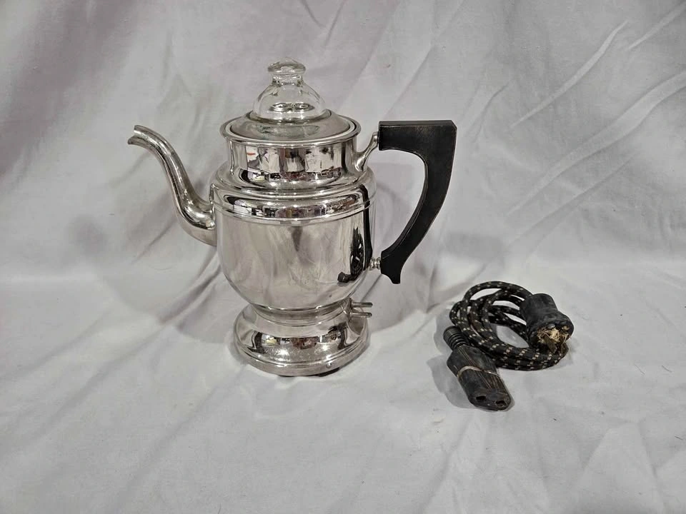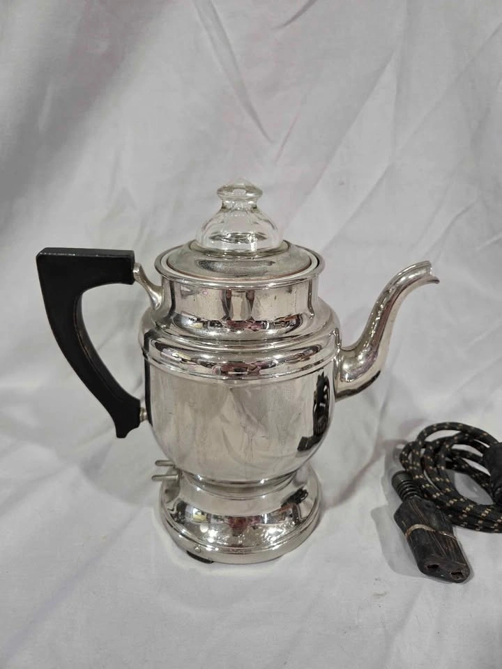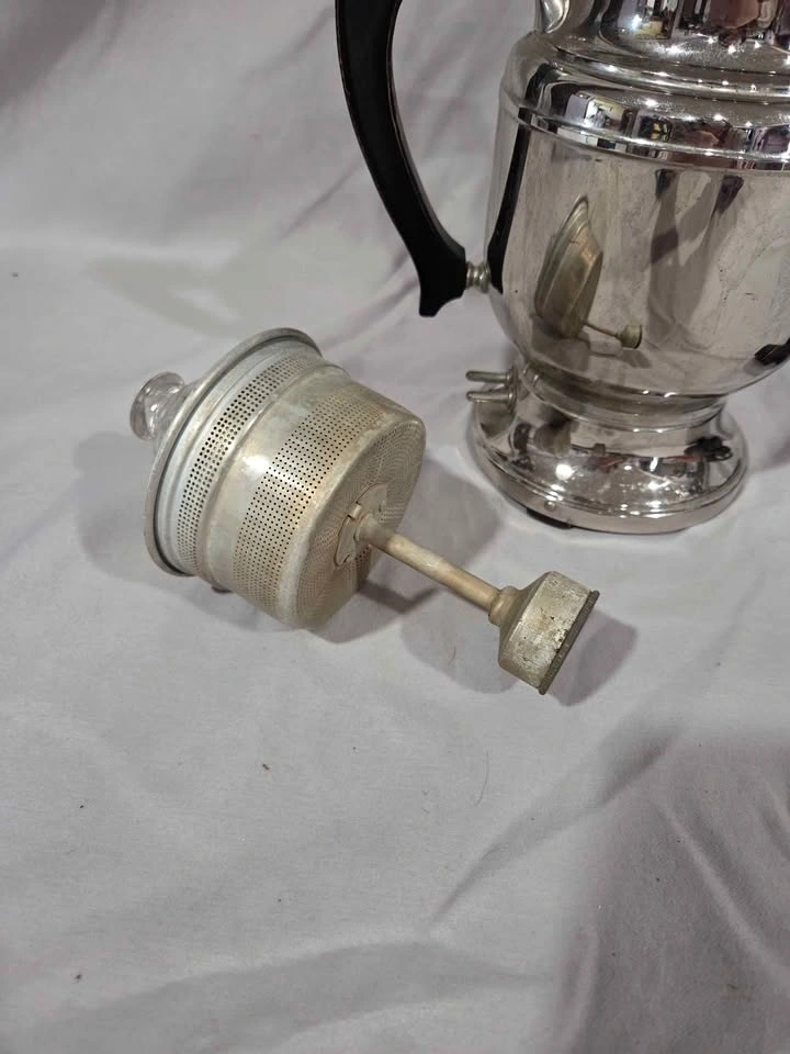 This is a neat, worn, but functional percolator in as-found condition, other than cleaning of the kettle. It's a neat entry-level collectible piece, or a usable piece of tech that is likely over 50 years old. Feel free to ask any questions.