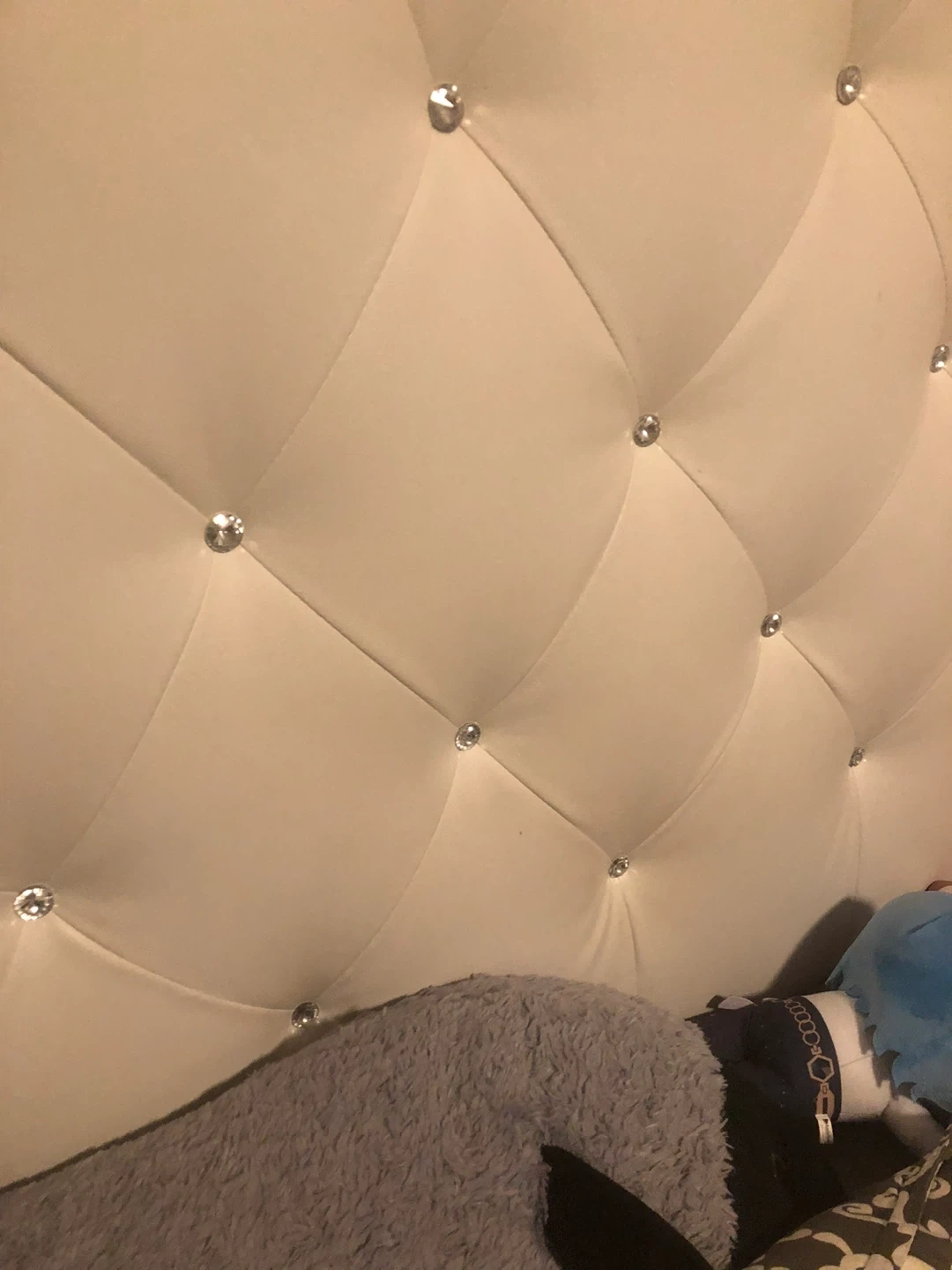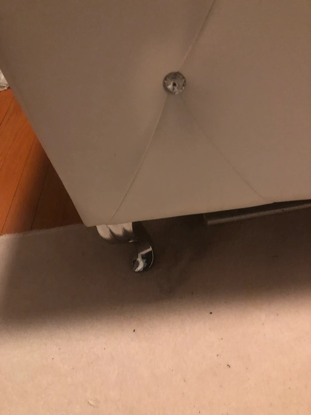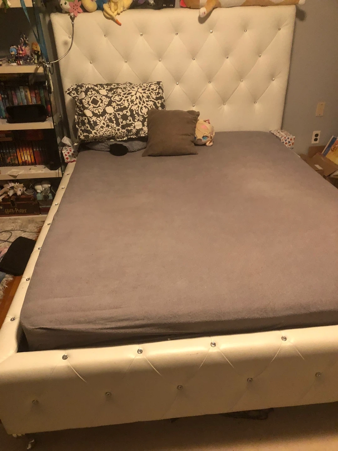 Diamond tufted upholstered bed frame in white. It features crystal button accents on the headboard and footboard. Includes metal legs with rolling casters on the footboard.