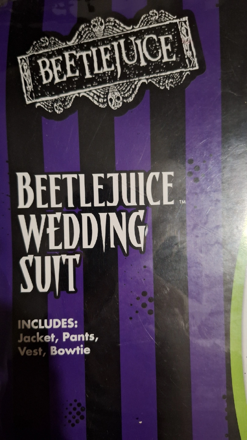 10Selling a brand new, in-package Beetlejuice Men's Wedding Suit for adults! The size is Large. The suit includes the jacket, pants, vest, and bowtie. Originally bought for $69.99. Asking $45 OBO.