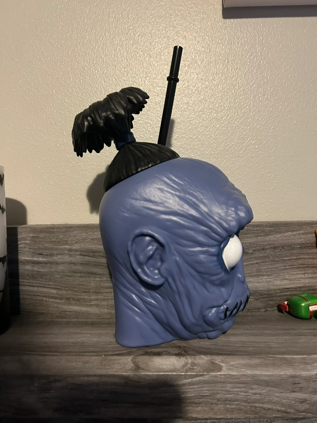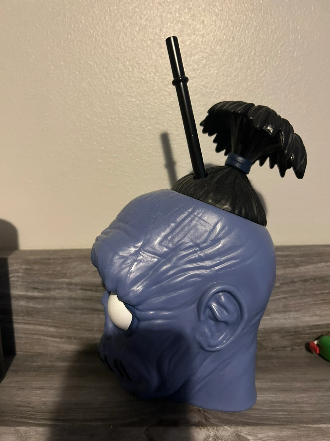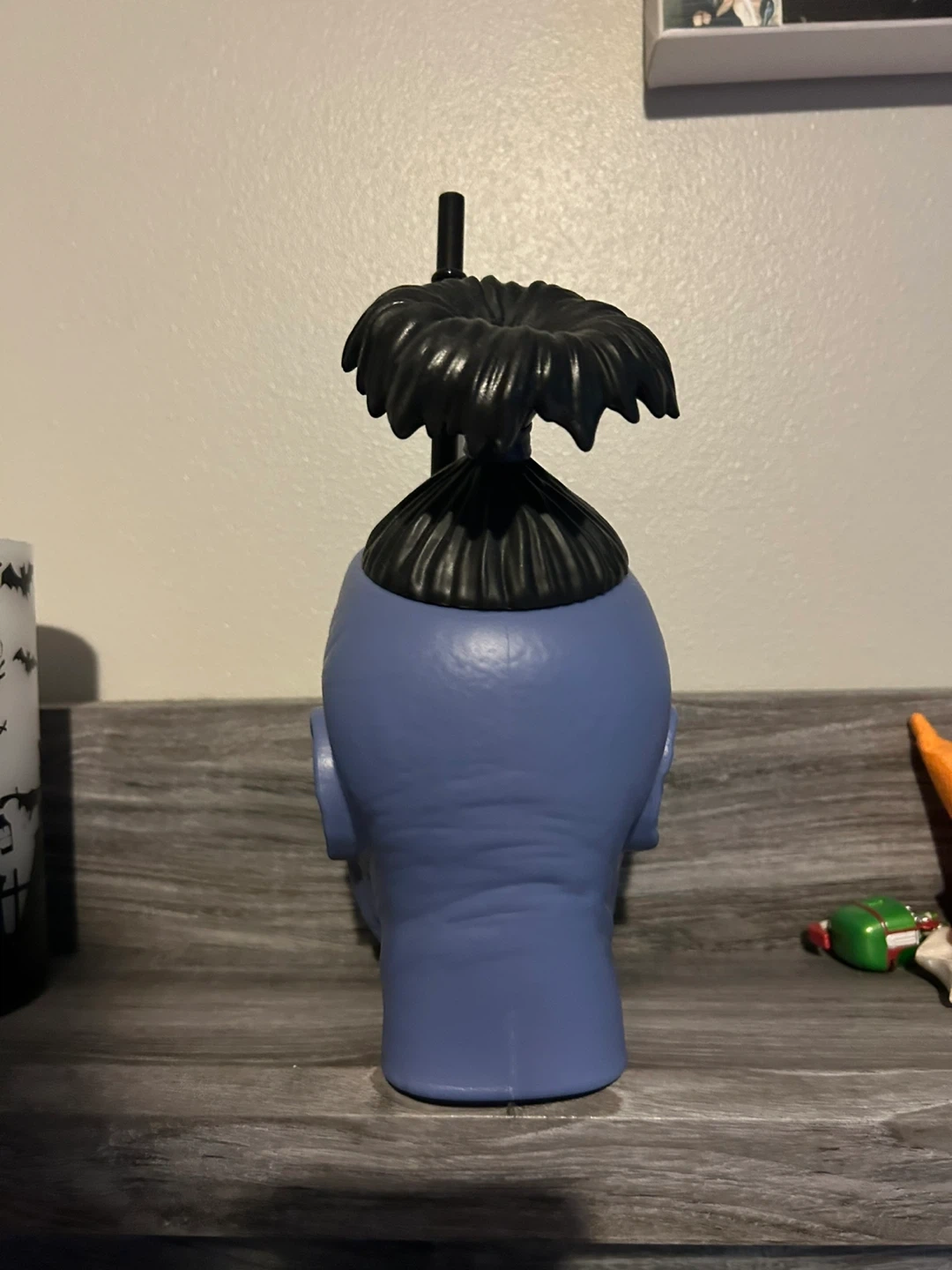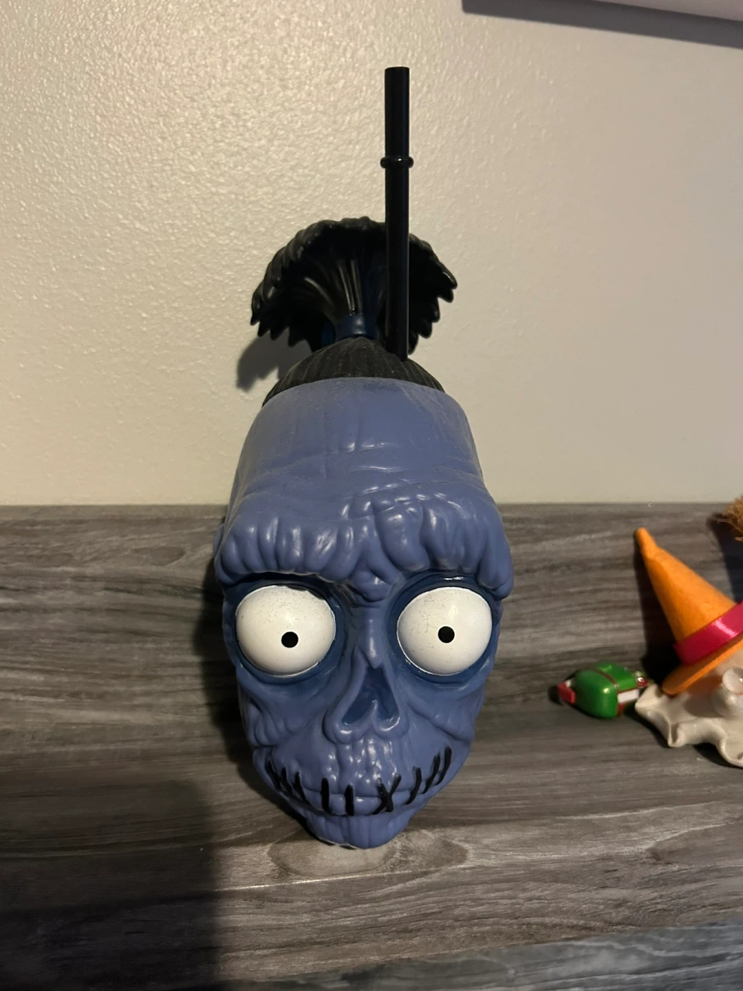 This is a Beetlejuice Beetlejuice Shrunken Head sipper cup. It is a blue head with a straw and a black hair piece. It is in great condition - never been used, only displayed, comes with straw!
