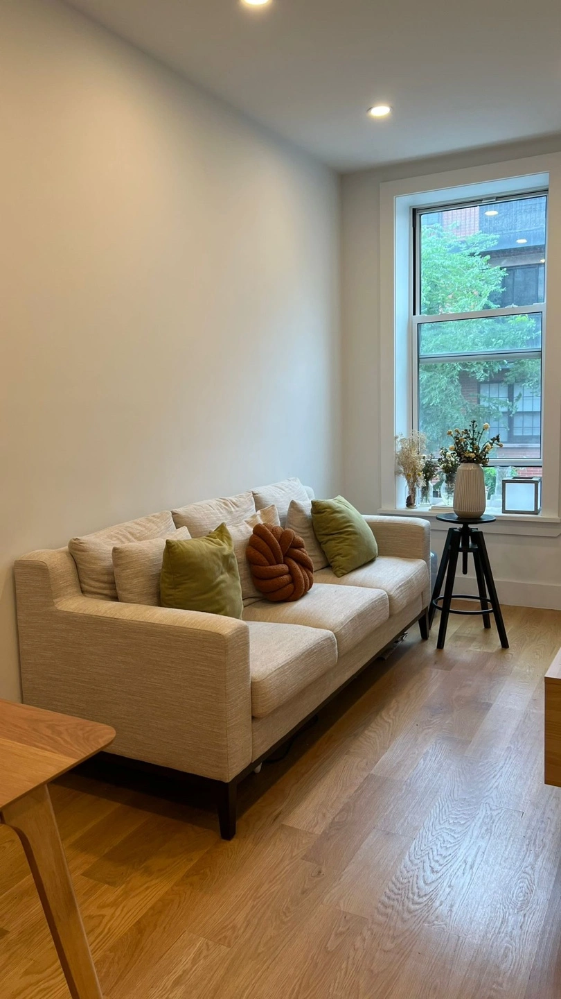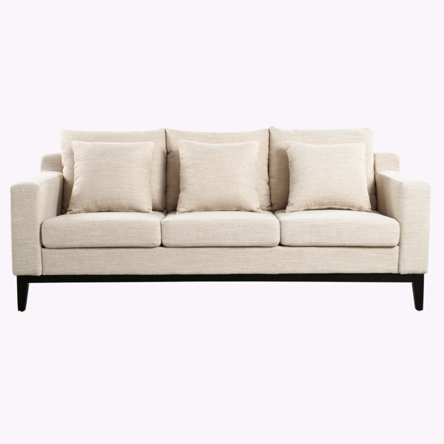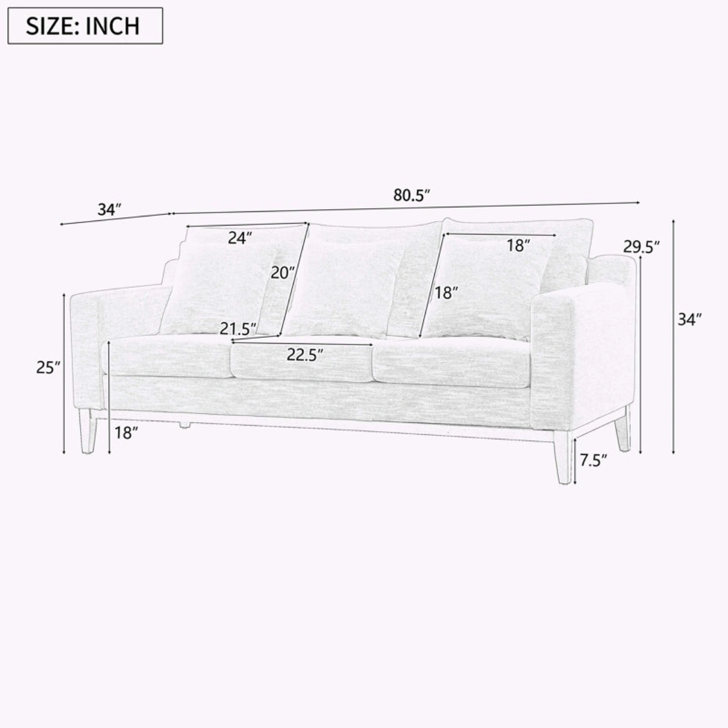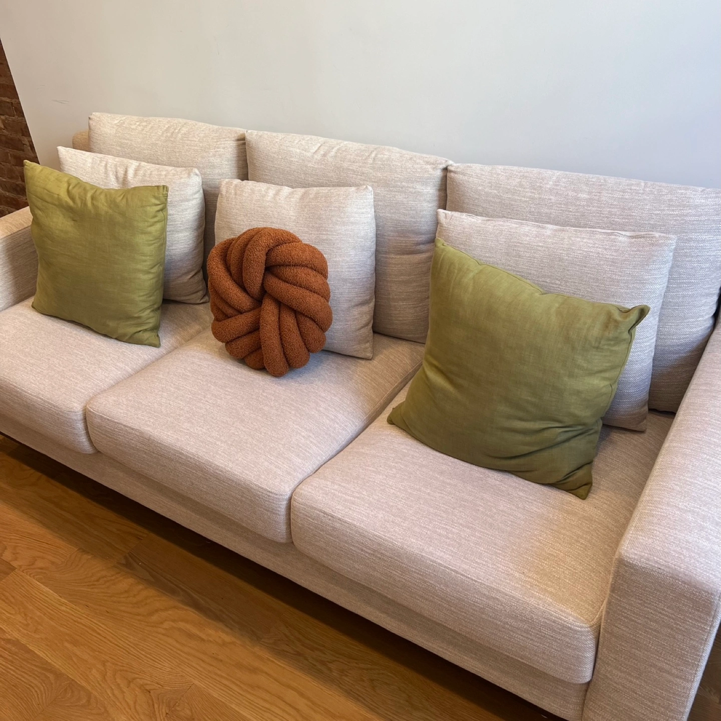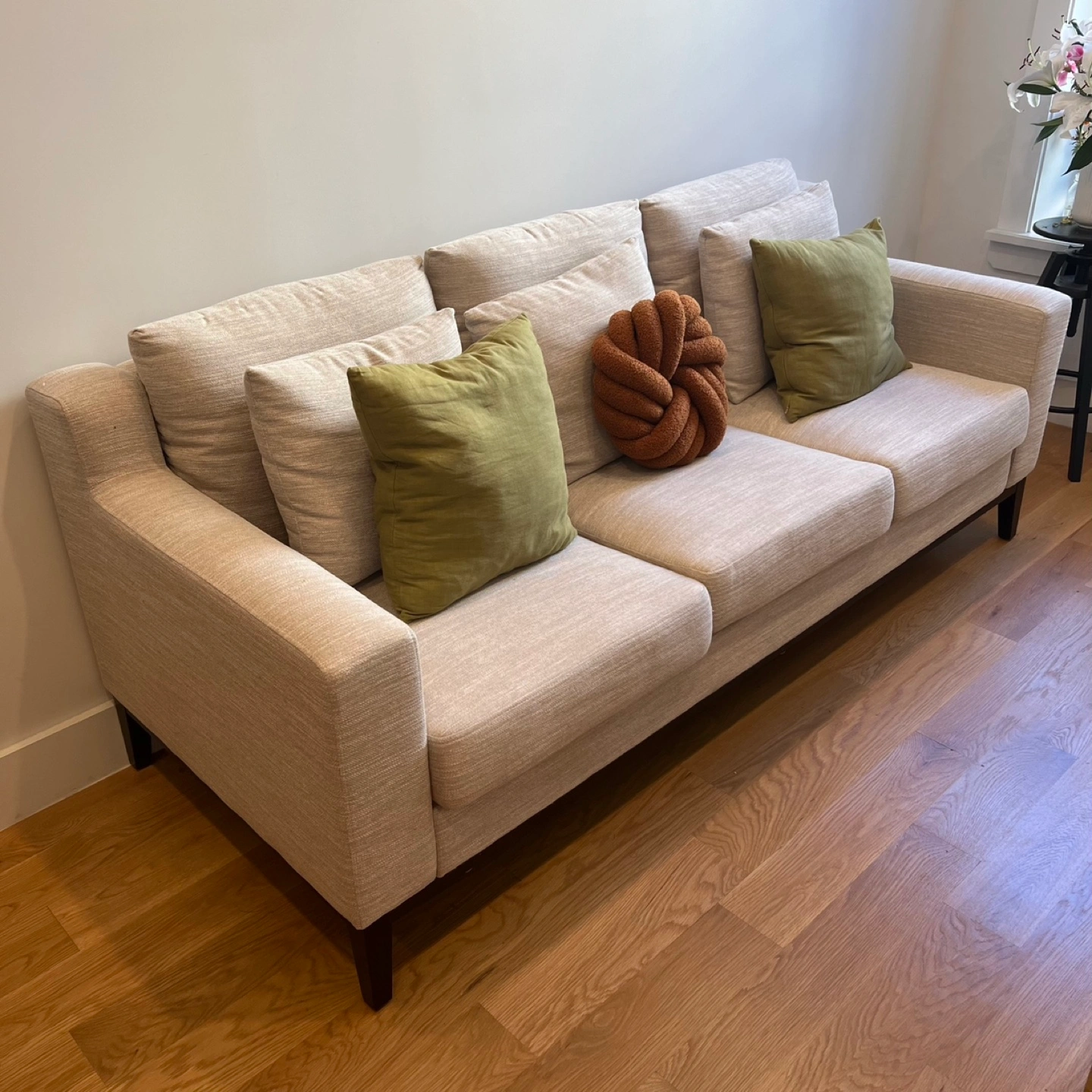 10Comfortable, stylish, and durable three-seater sofa that elevates the space instantly. It is free of pet hair since we never owned one. Will clean it up for you. Ready for pick up starting August 23rd in Greenpoint, Brooklyn. - Includes 3 beige toss pillows (not the colored ones) - Dimensions: 80.5” W x 34” D x 34.5” H - Seat Height - Floor to Seat: 18 '' - Seat Depth - Front to Back: 21.5 '' - The seat covers are removable for easy wash - Sofa frame is wood