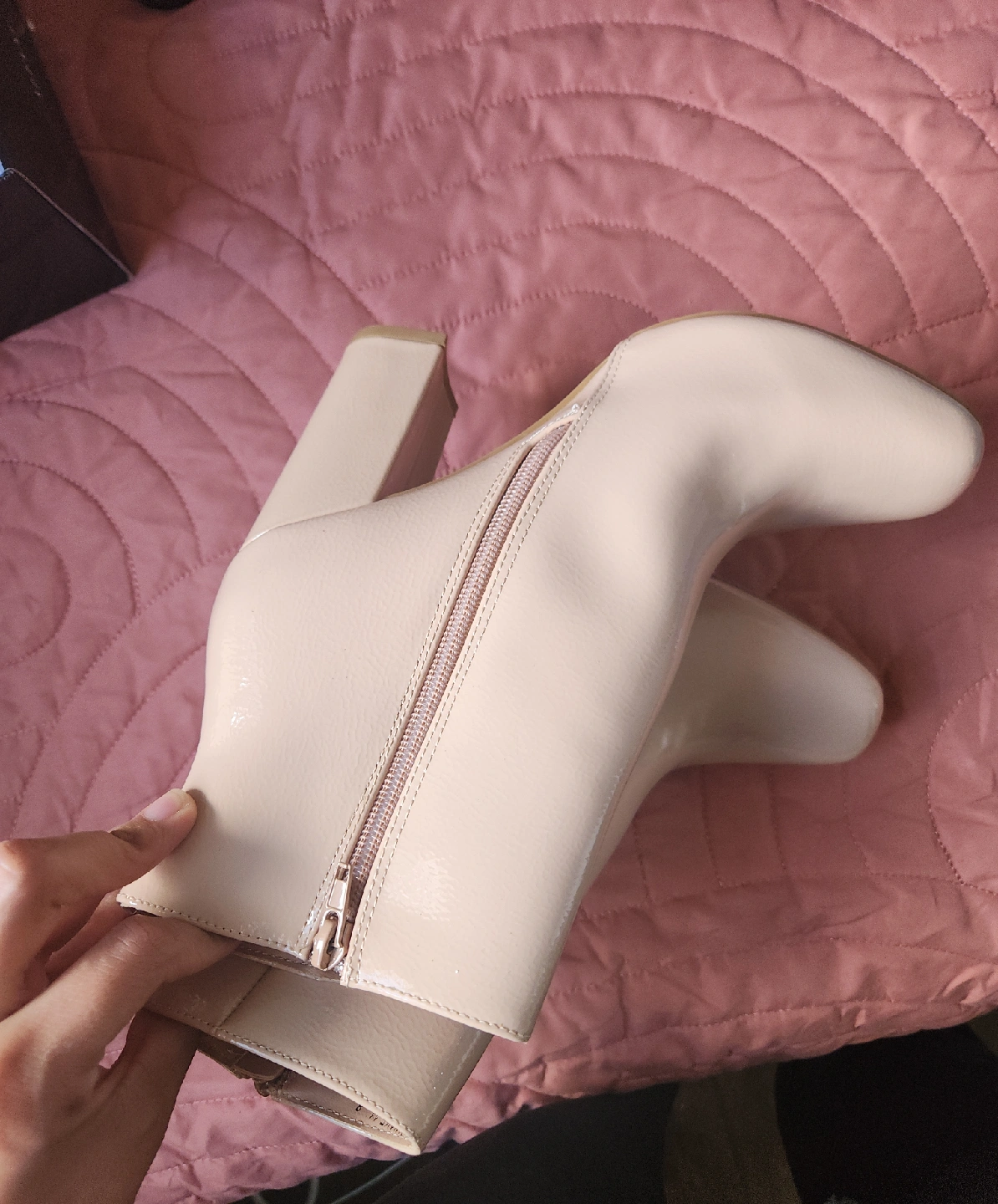 Selling a pair of beige ankle boots. They have a block heel and a zipper closure. Perfect for adding a touch of style to any outfit!