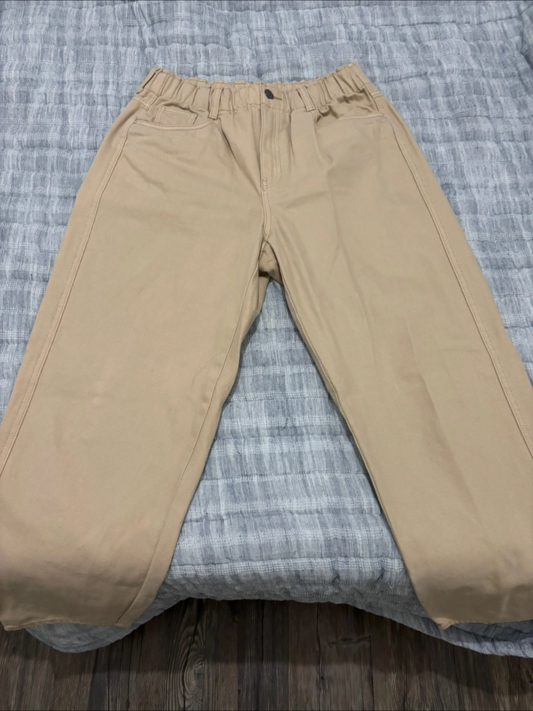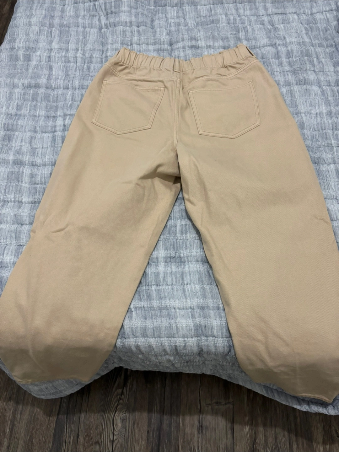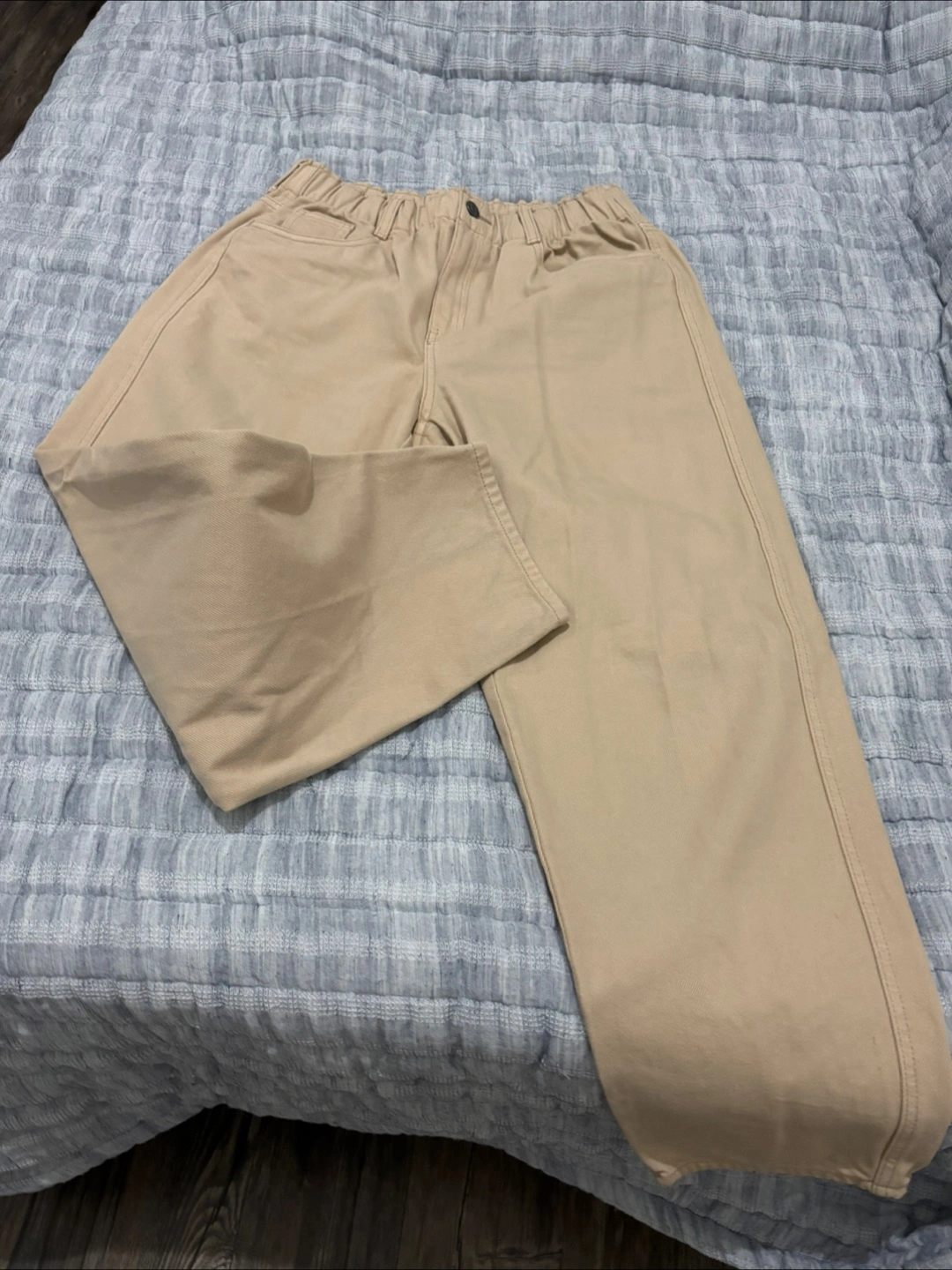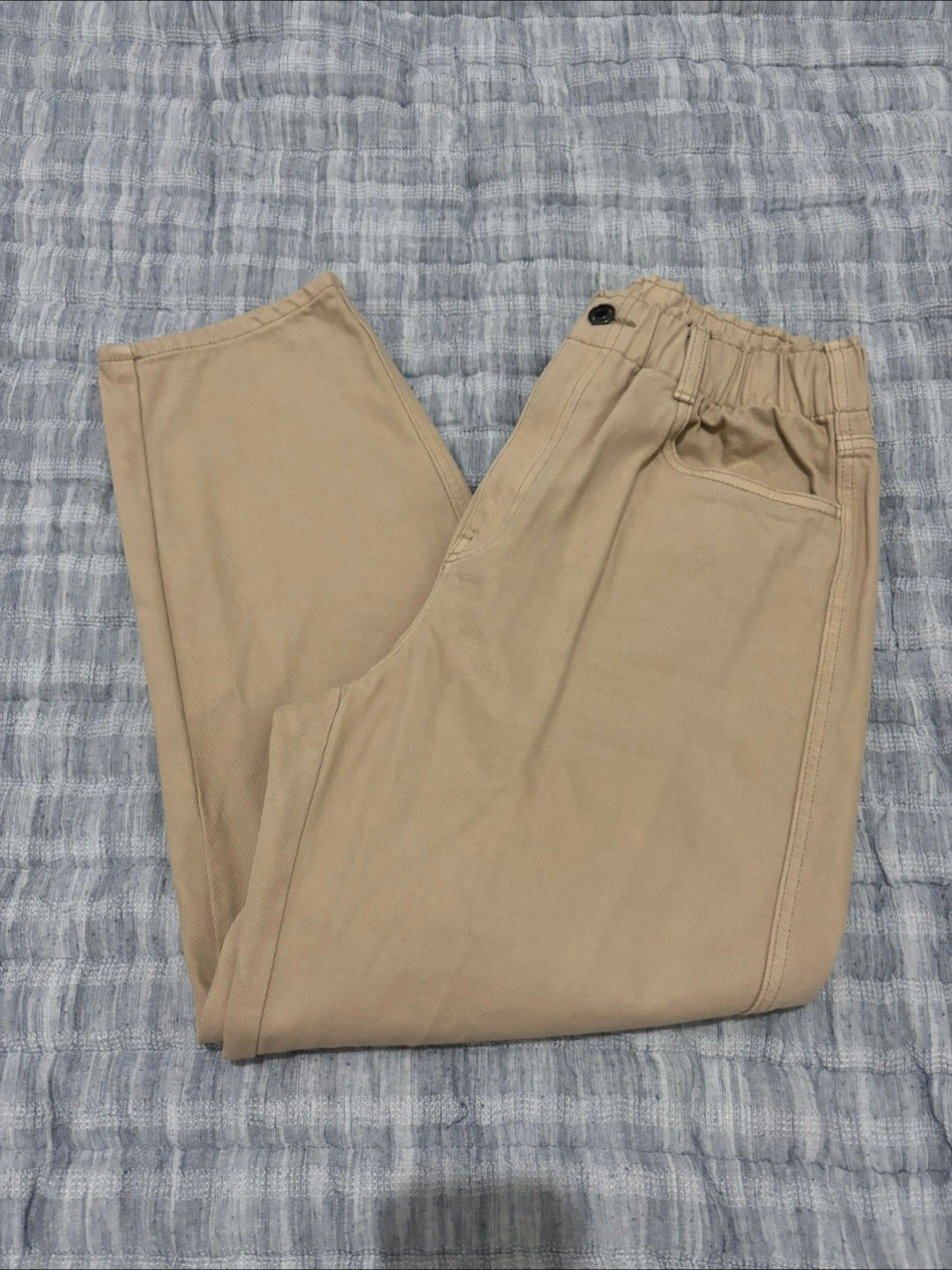 Selling a pair of beige pants with an elastic waistband. They're in great condition and ready for a new home!