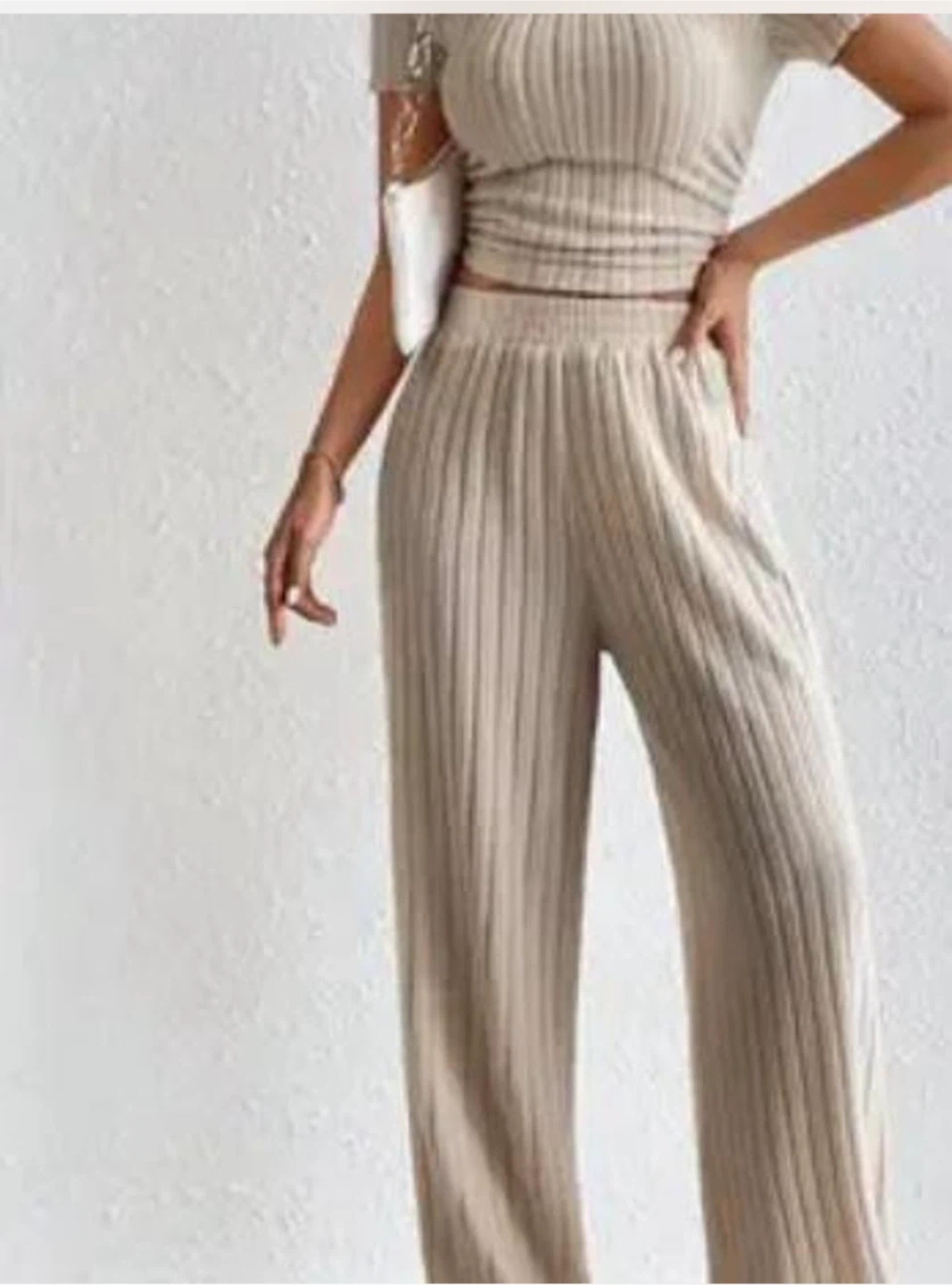75This is a cute beige knit two-piece set. It looks to be in great condition and ready for a new home! The material appears to be soft and comfortable, perfect for lounging or a casual outing. In great condition, I'm just too short for it lmao.