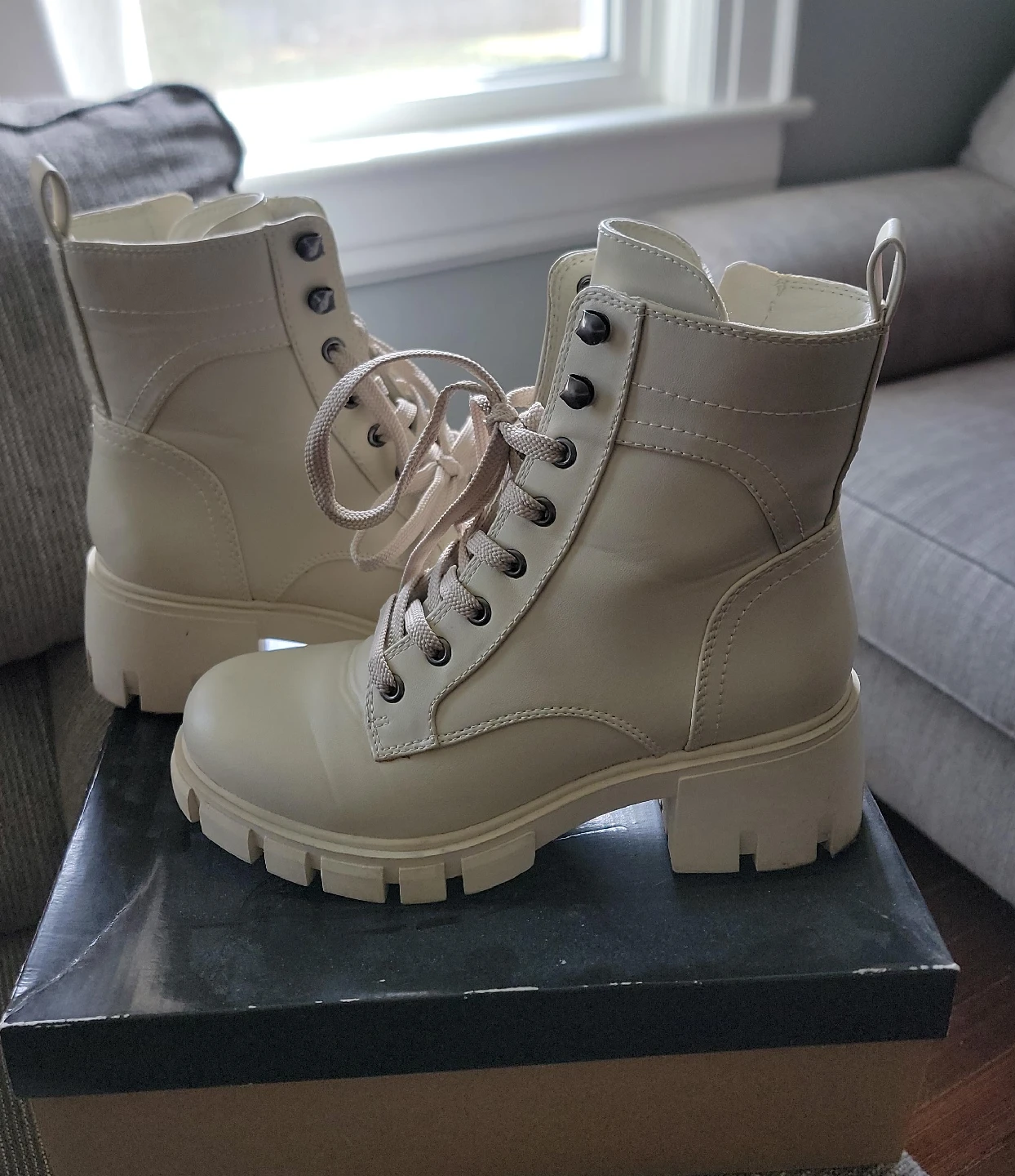 10These beige ankle boots are in great condition and ready for a new home! They feature a lace-up design and a chunky heel, perfect for adding a bit of edge to any outfit. They come with the original box