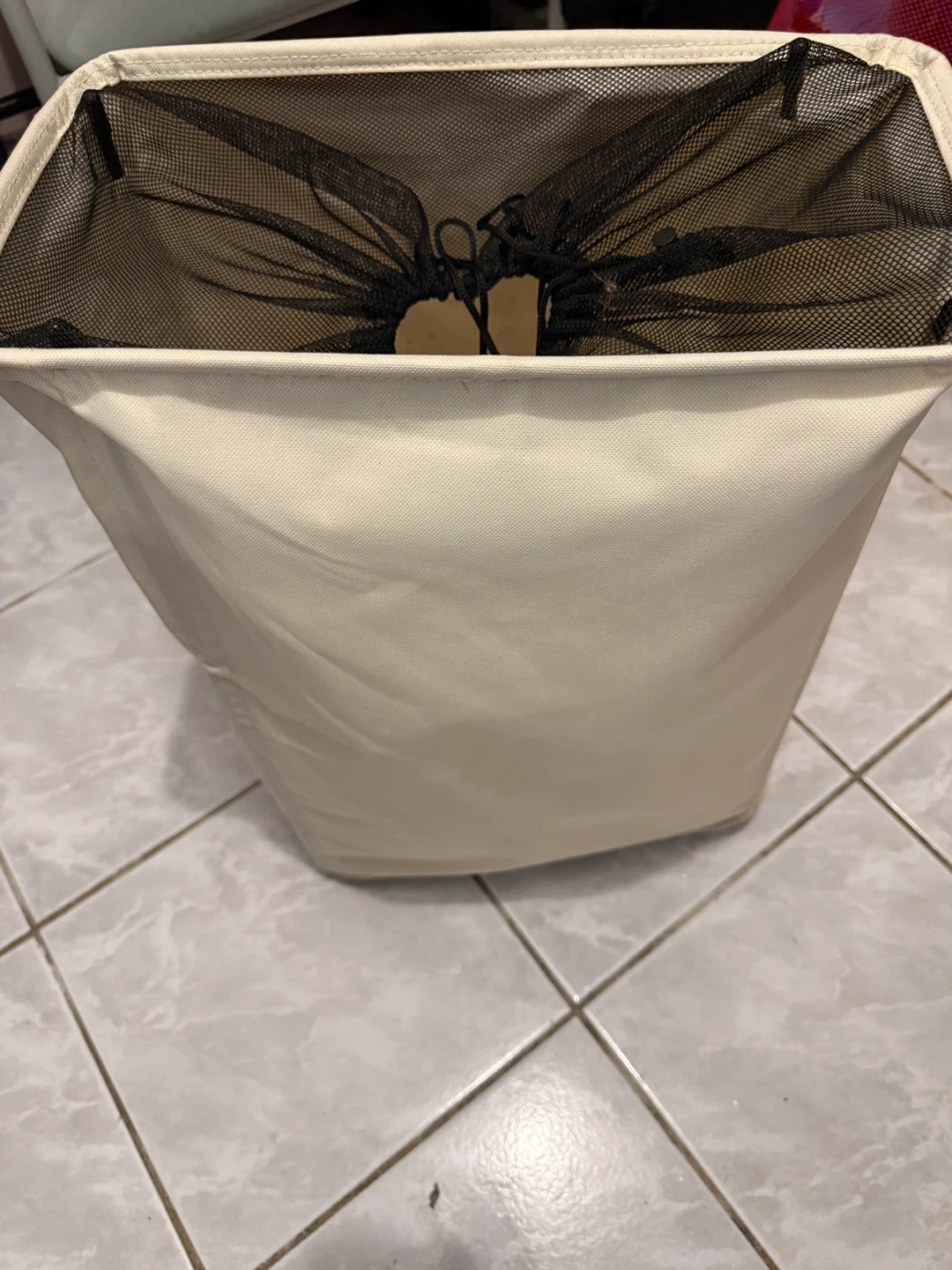 Selling a beige laundry hamper with a mesh top! It's in great condition and ready to help keep your laundry organized