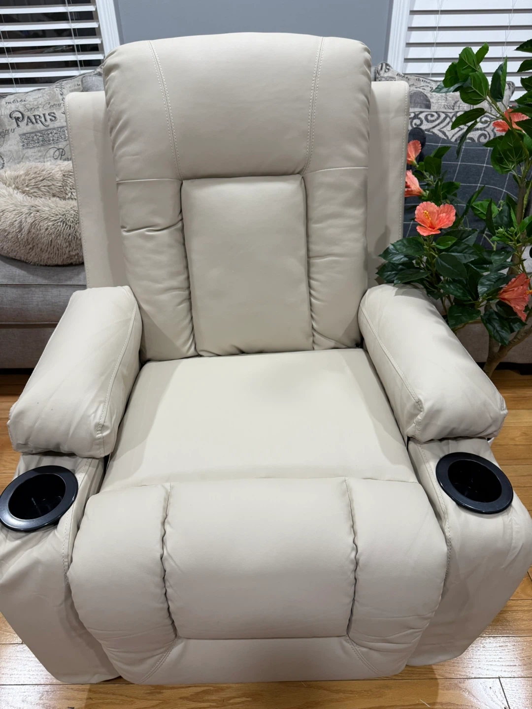67This beige leather recliner is perfect for relaxing! It features shoulder, lumbar, and thigh massage functions, as well as lumbar heating. It also has convenient cup holders on both sides