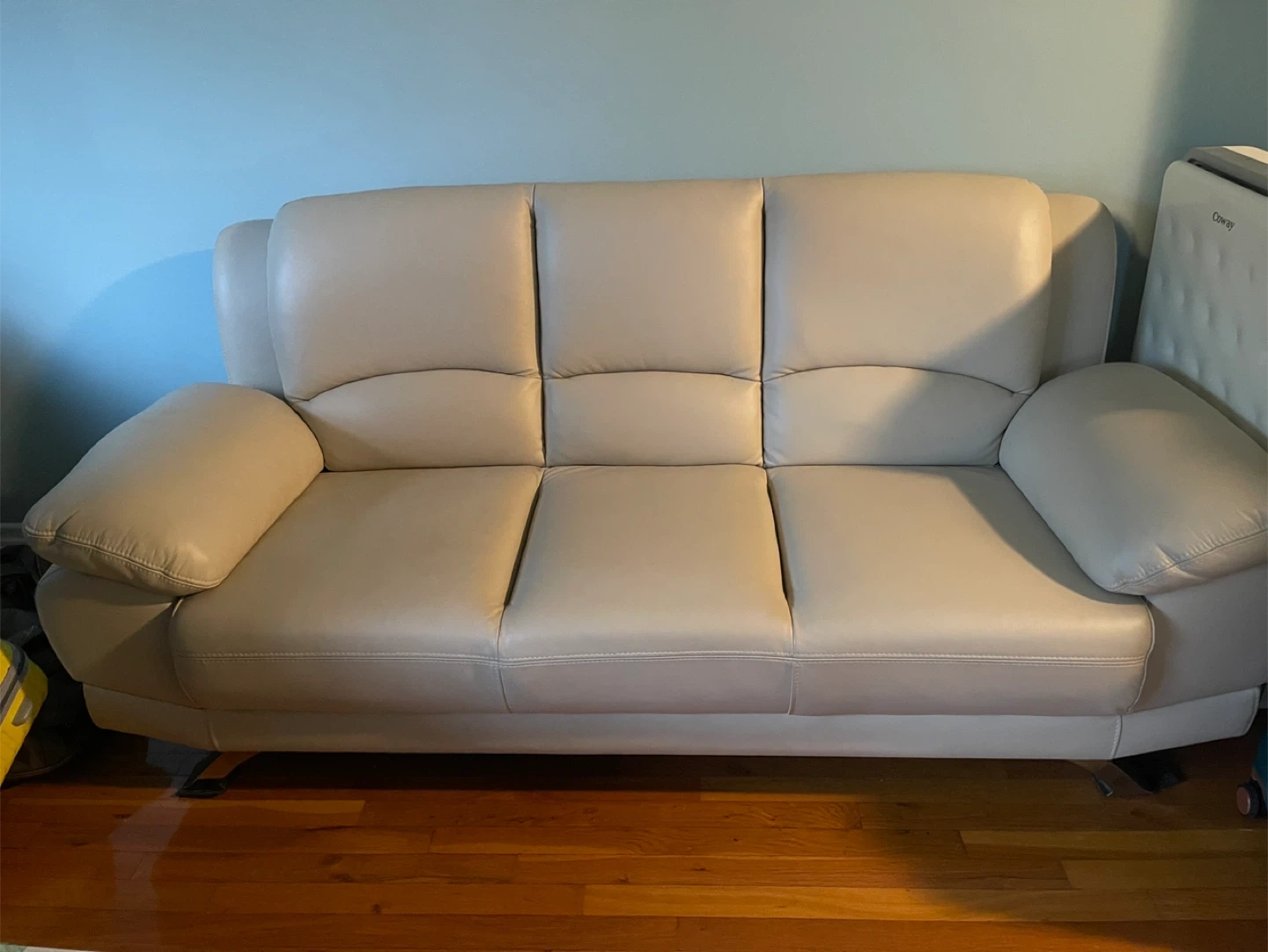 Selling a comfortable beige leather sofa. It features a three-seat design with cushioned armrests and a sleek, modern look. The sofa is in good condition and ready to add style to your living room! L-6f, W-3f, H-3f
