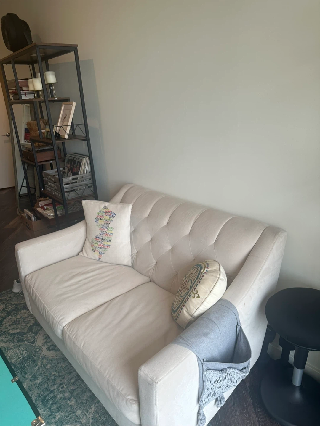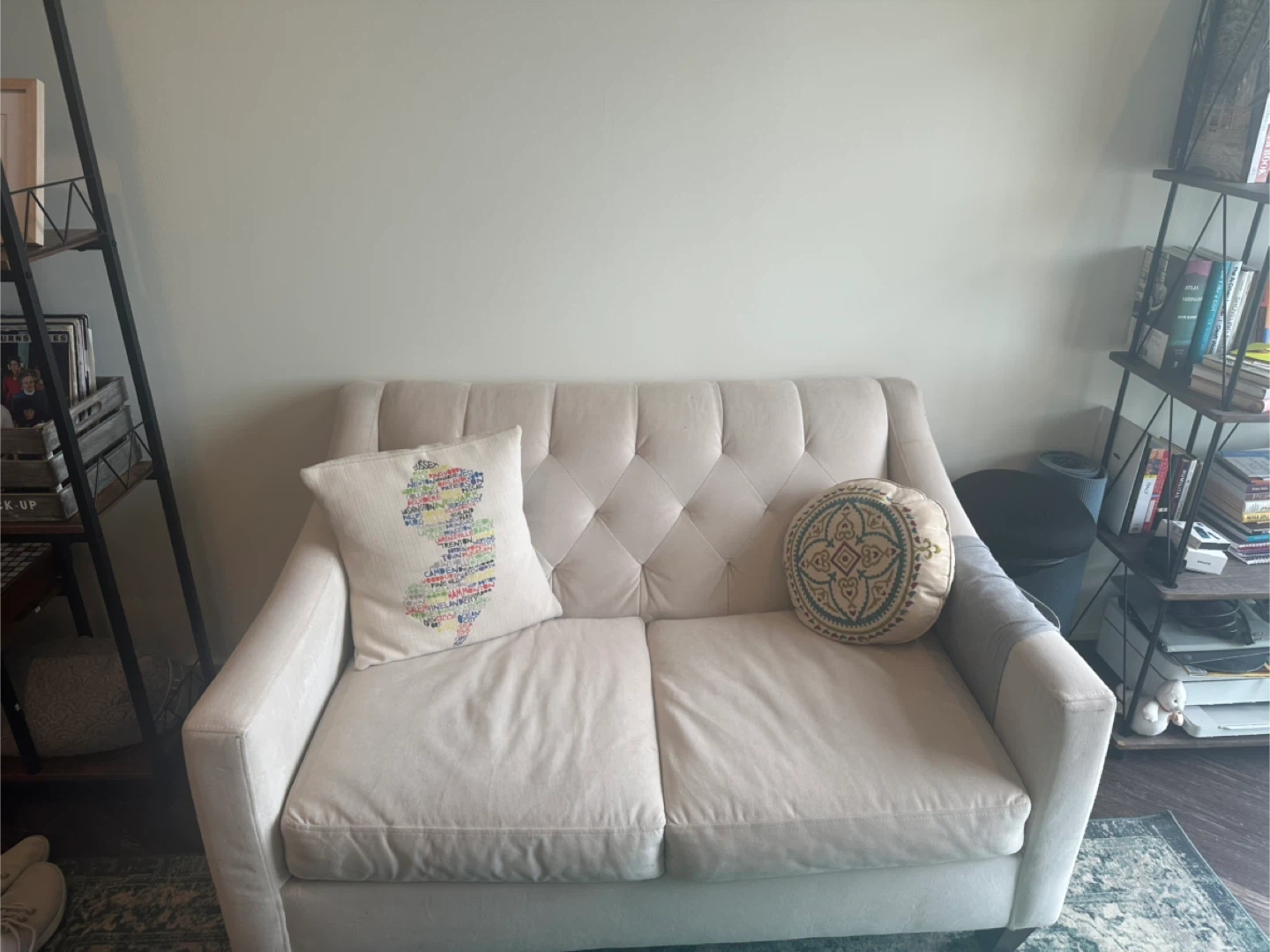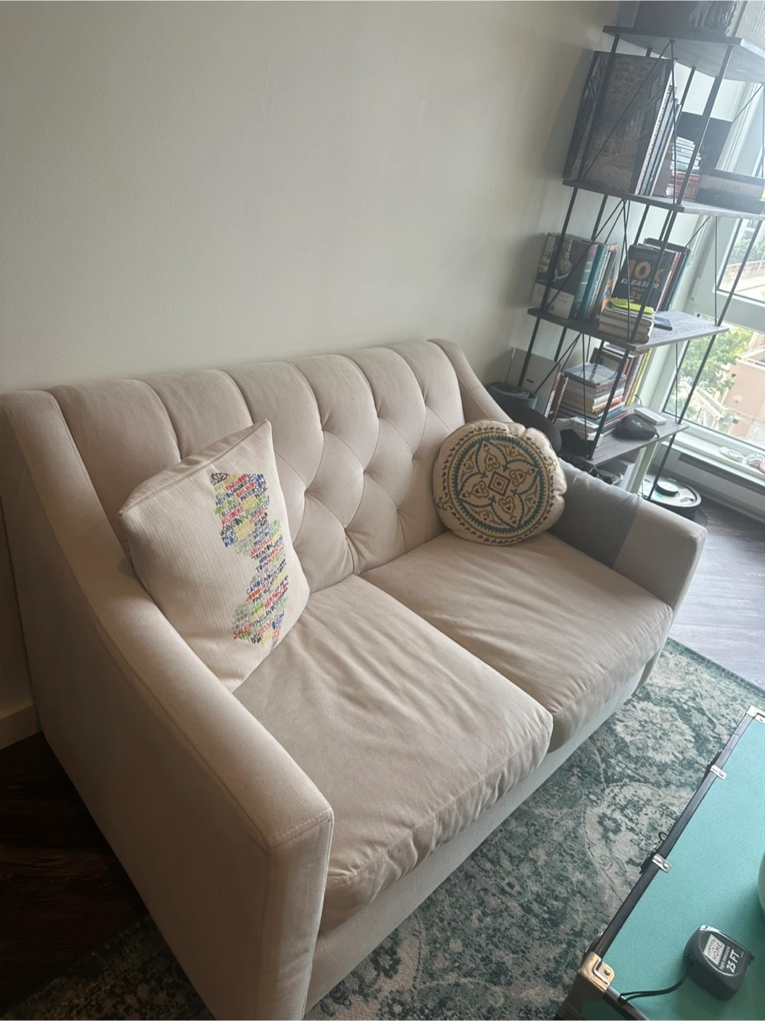 Selling a comfy beige / off white loveseat sofa. It's in great condition and would be a perfect addition to any living room or small space. It's a neutral color that would match any decor! Minor marks on upholstery and the legs. Must pick up. Cannot deliver. Width 53” Height 36” Seat depth 23”
