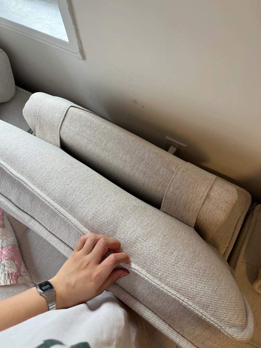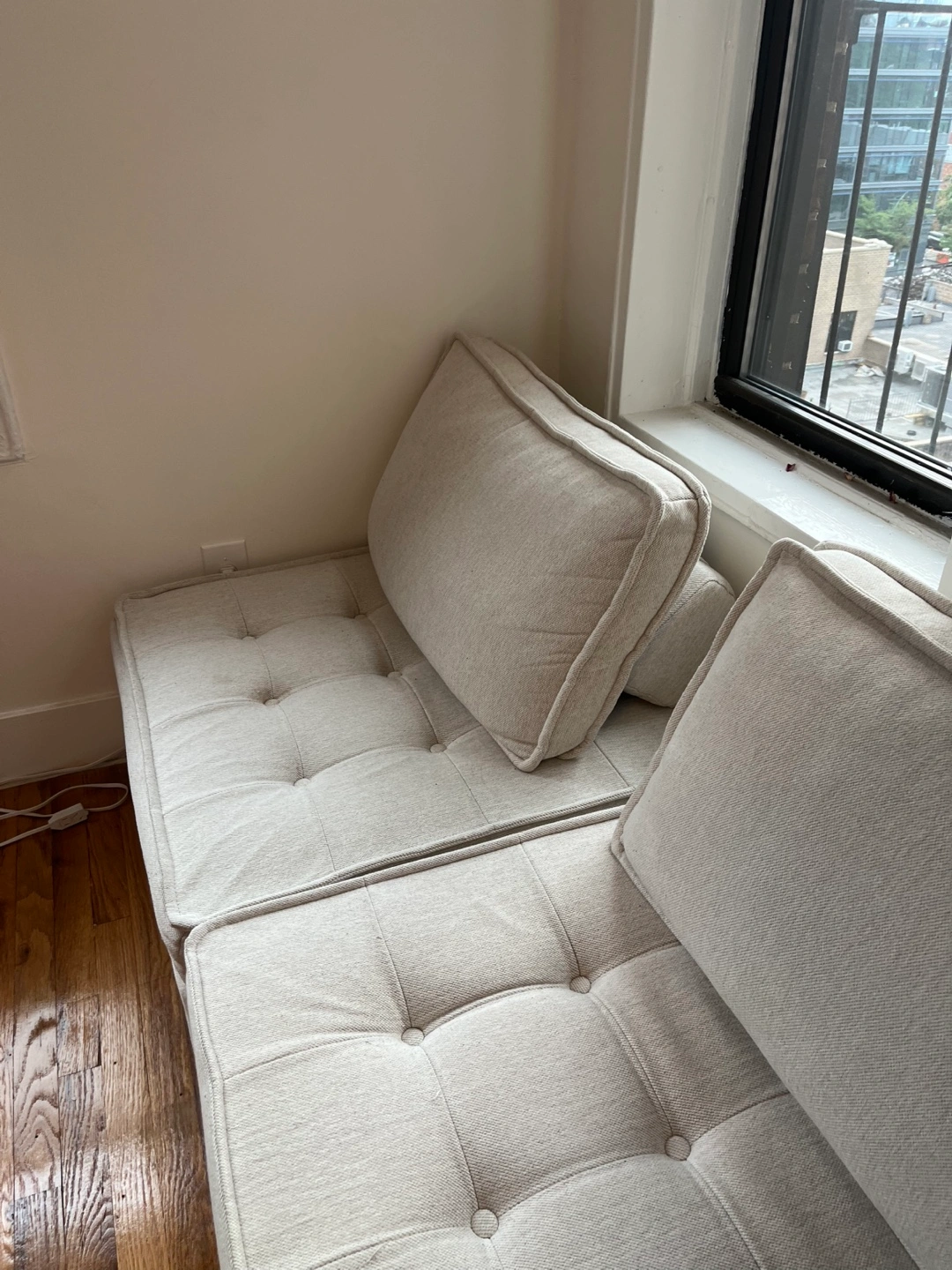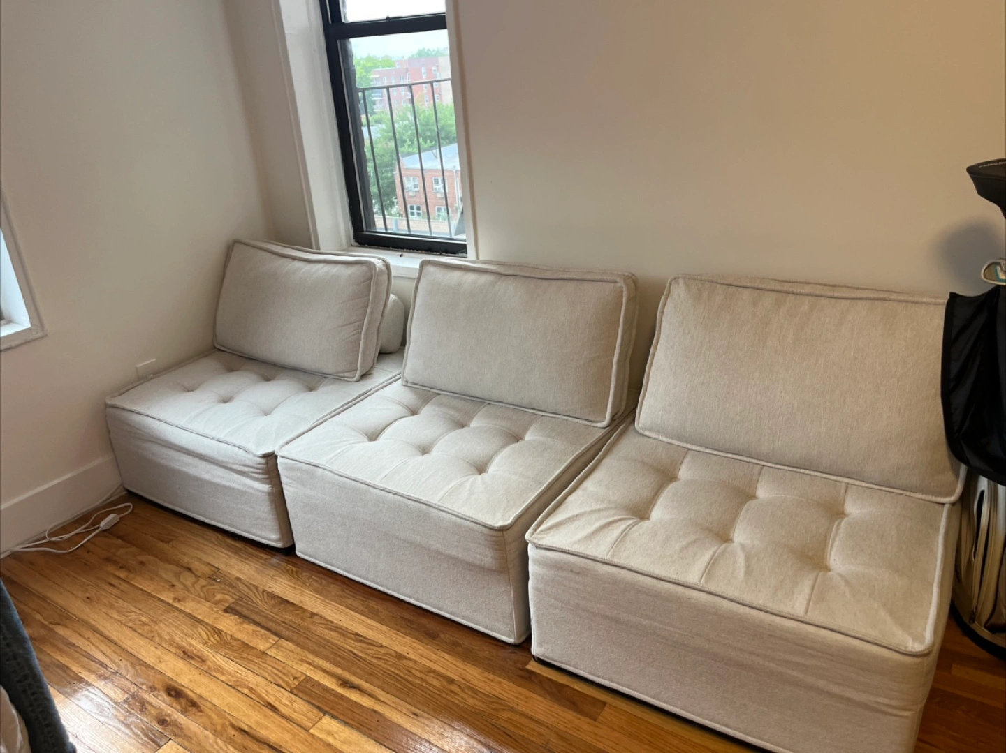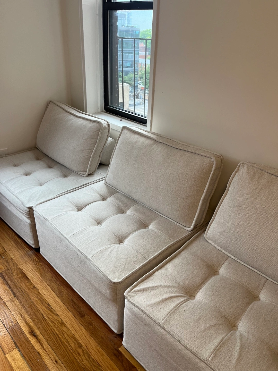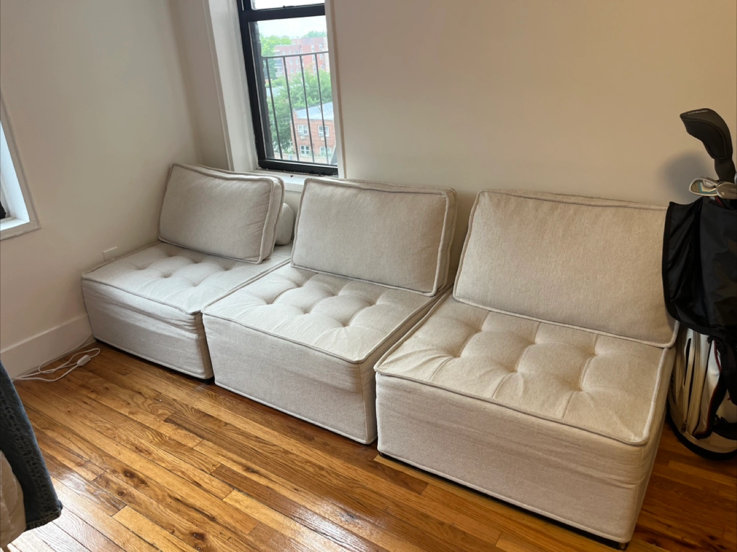 10Selling a modular sectional sofa in beige. It's in great condition and ready to find a new home! The cushions are soft and comfortable, perfect for lounging. It's a versatile piece that can be arranged in different configurations to fit your space. Normal wears and tears. Buyer to pick up at scheduled time with the Seller. No Refund Available after payment.