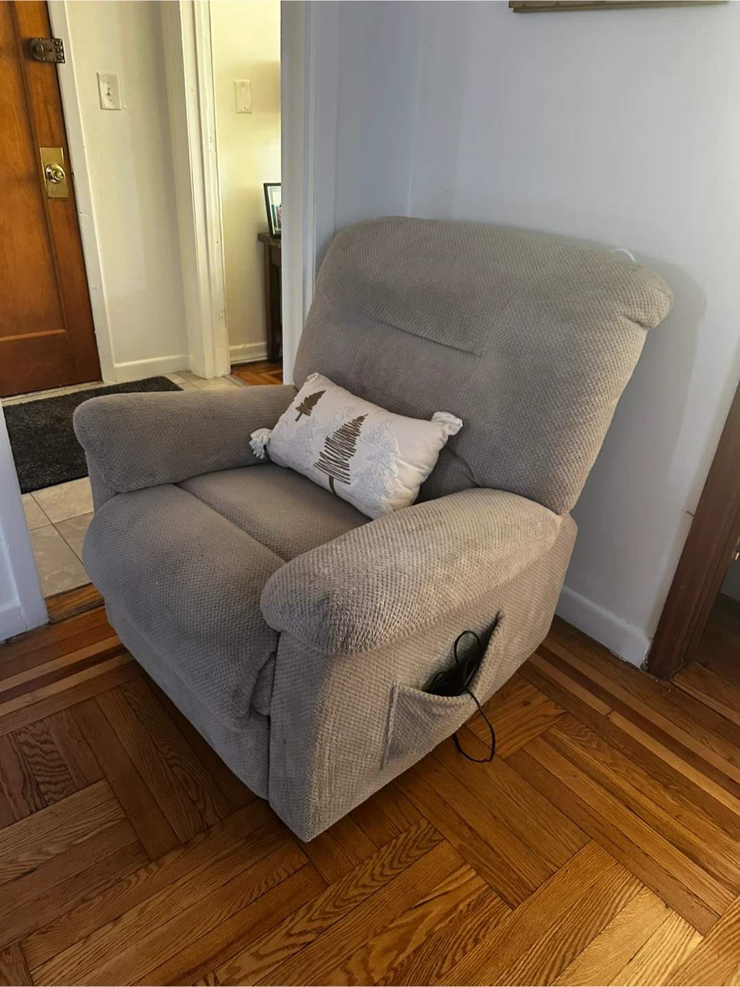 19Selling a comfy beige recliner chair! It's in good condition and perfect for relaxing after a long day. It has a pocket on the side for storage and it’s electric. It lifts up to assist from easier get-up and reclines flat to help you lay down and rest