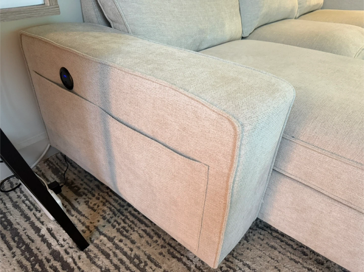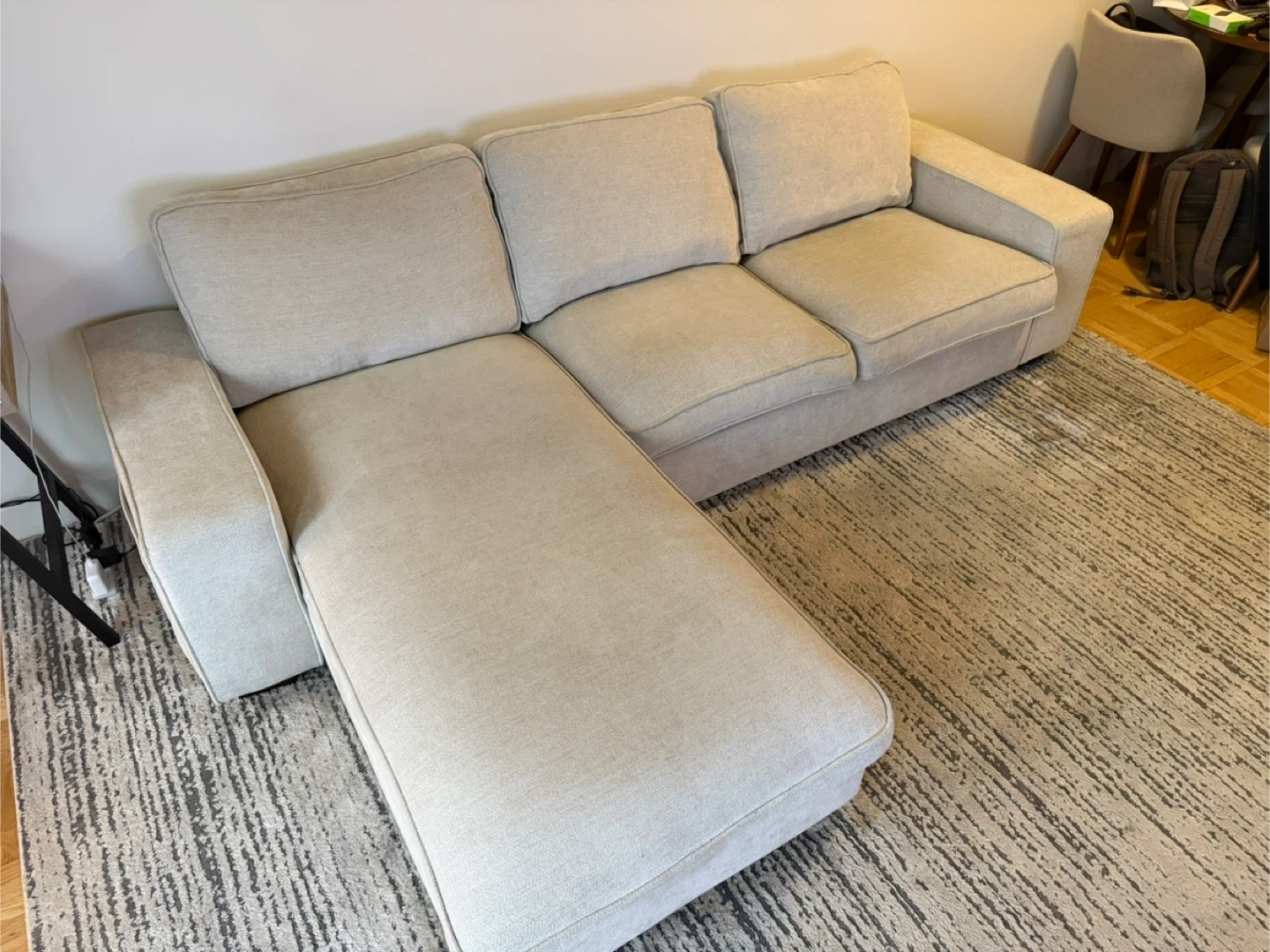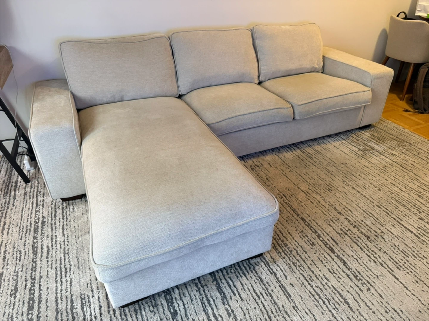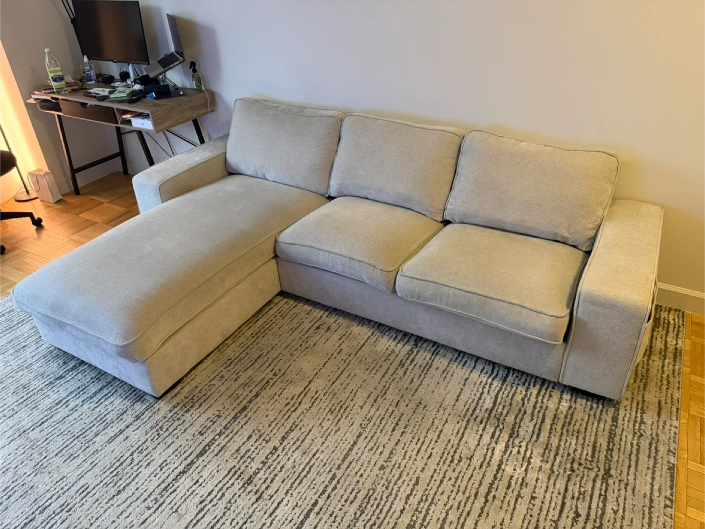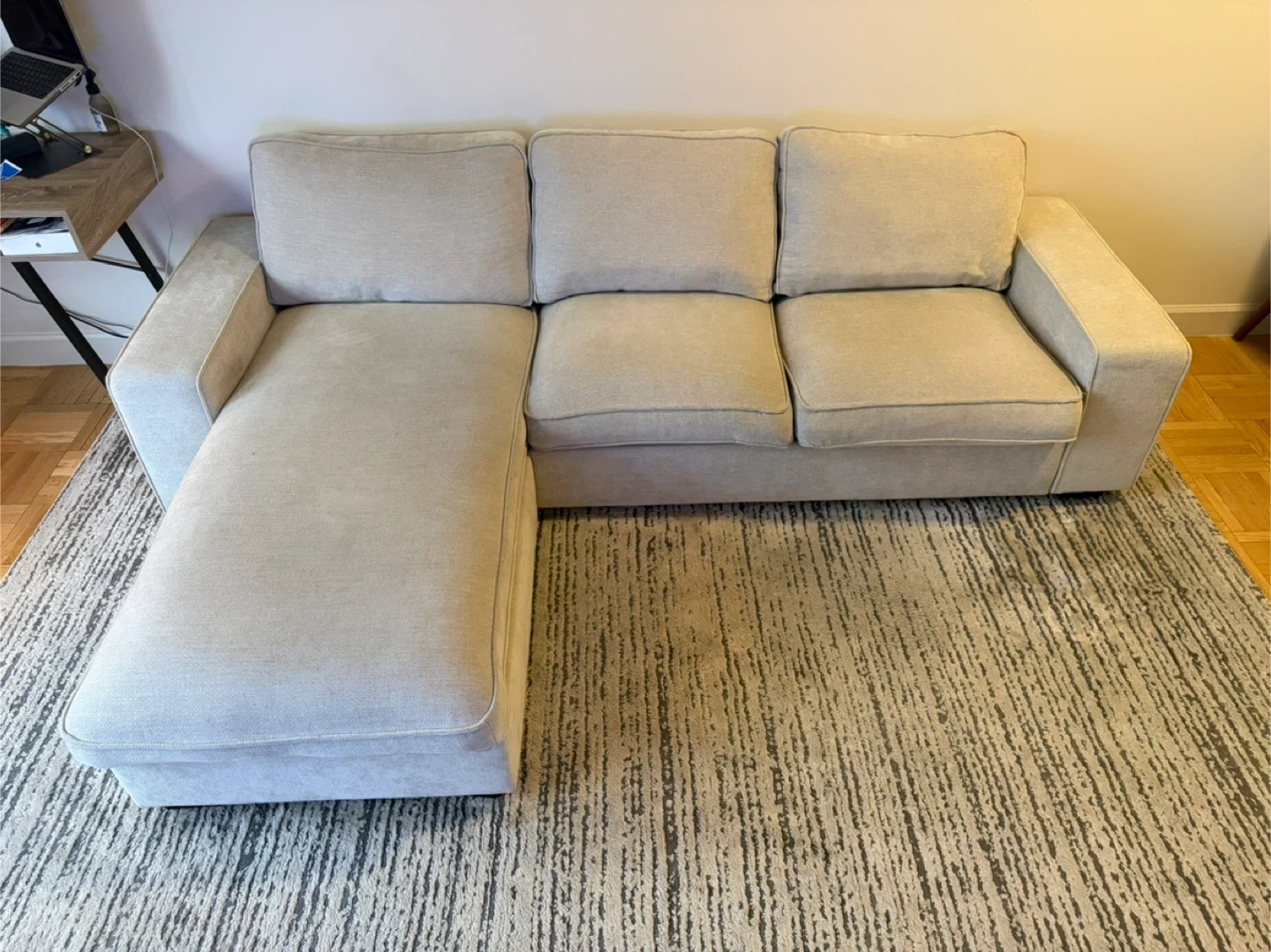 10Selling a comfy beige sectional sofa! It features a chaise lounge for extra relaxation and a convenient side pocket on the armrest. Perfect for lounging and adding a touch of style to your living room Inside storage in chaise. One year old Collection only