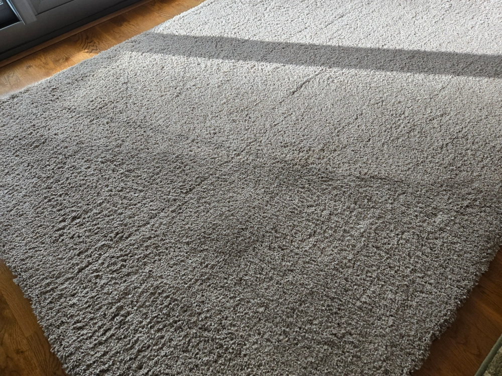 81Selling a beige shag rug that would be perfect for adding some coziness to your space. It's in great condition and ready for a new home! 5 ft. x. 7ft