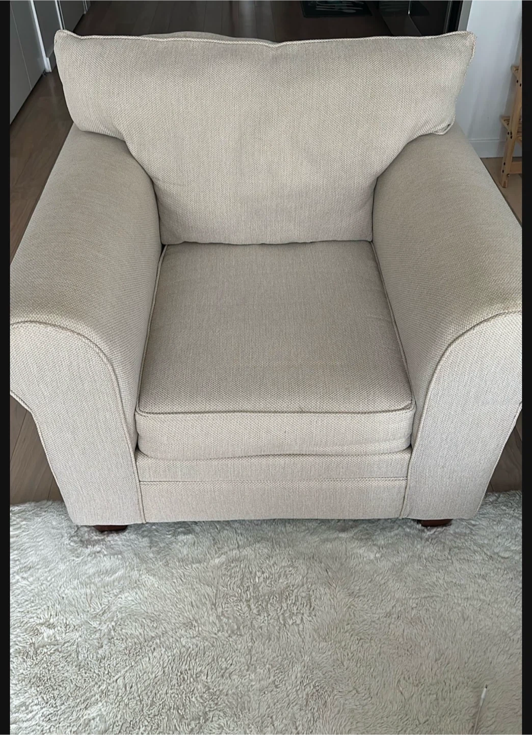 Selling a comfy beige sofa with a matching ottoman! The ottoman also has storage space inside, perfect for blankets or anything else you want to keep handy. It's a great set for relaxing and adding a cozy touch to your living room