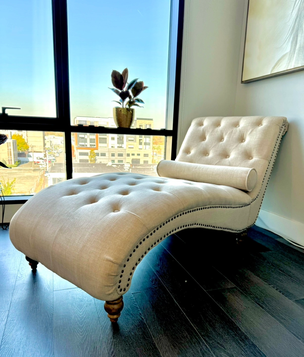15Chaise lounge with beige tufted back and pillow. Features nailhead trim.