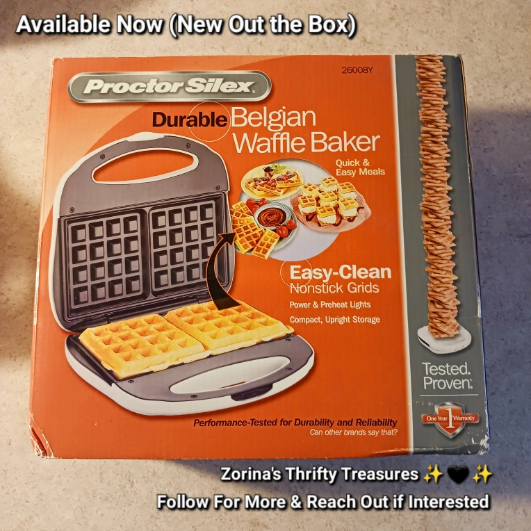 15I'm Selling a Brand New Proctor Silex Electric Durable Belgian Waffle Baker, still in its Original Box! It features Easy-Clean Nonstick Grids and has a Power and Preheat light System. It's also designed for Compact, Upright Storage. This waffle maker is Performance-Tested for Durability and Reliability. If You're Someone who Loves making your own Waffles or know someone who does, then this is the Perfect Gift to Give All Year Around or during the Holiday Season. *** Reach out if you're interested in Purchasing this Item to obtain more information about how to successfully do so. SERIOUS INQUIRES ONLY *** Happy Thrifting ✨️🖤✨️🖤✨️🖤✨️🖤✨️🖤✨️ Please Be Advised: This unit has been tested and fully pre- inspected for optimal peak performance and smooth functionality upon use by any of our prospective customers. All Sales Are Final.