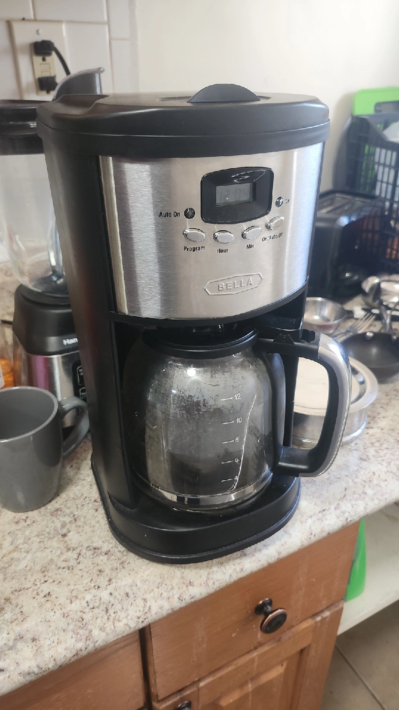 Selling a Bella coffee maker. It has an auto-on feature, and you can set the program and hour. The carafe measures up to 12 cups