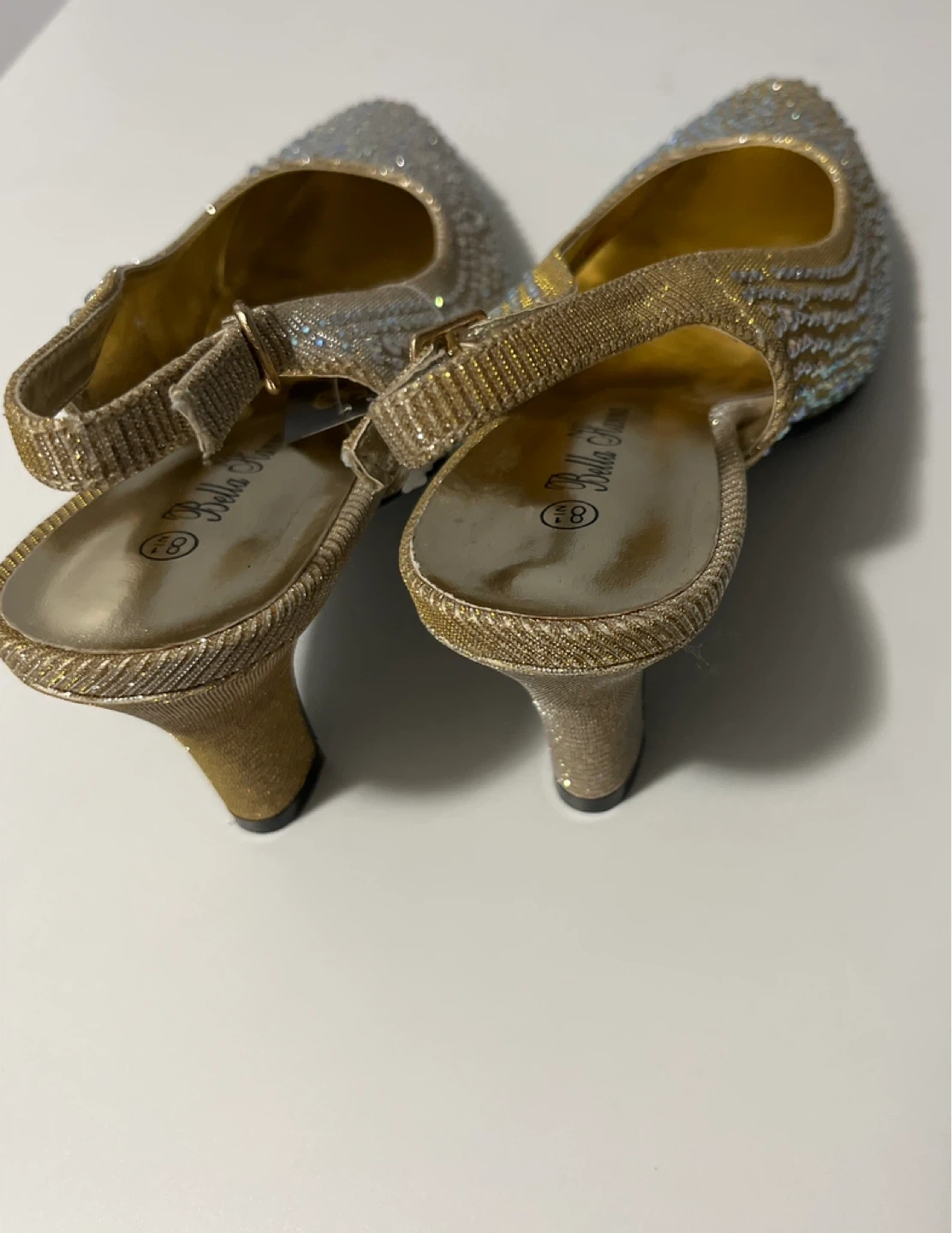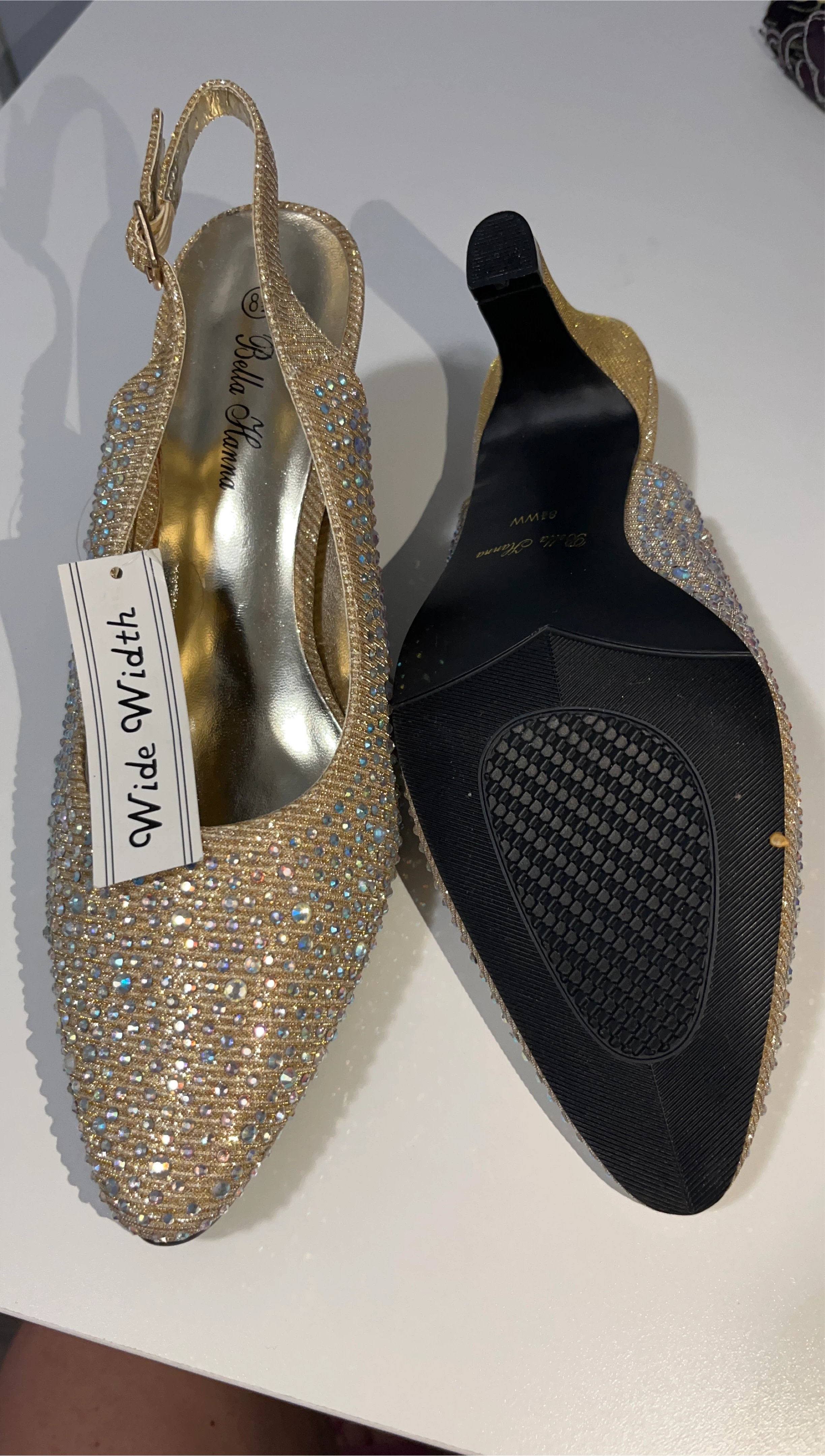 Selling a pair of Bella Hanna gold heels in size 8 with a wide width. They are embellished with rhinestones and have a slingback strap. Perfect for a special occasion!