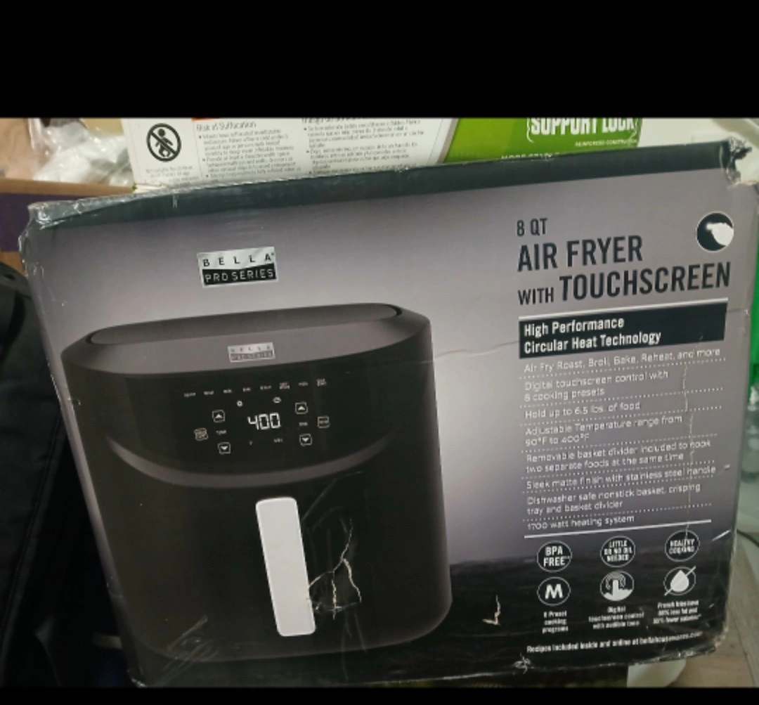Selling a Bella Pro Series 8 QT Air Fryer with Touchscreen! It has high performance circular heat technology, so you can air fry, roast, broil, bake, reheat, and more. It also has digital touchscreen control with 8 cooking presets. It can hold up to 6.5 lbs of food and has an adjustable temperature range from 90°F to 400°F. A removable basket divider is included to cook two separate foods at the same time! It features a sleek matte finish with stainless steel handle and dishwasher safe nonstick basket, crisping tray and basket divider
