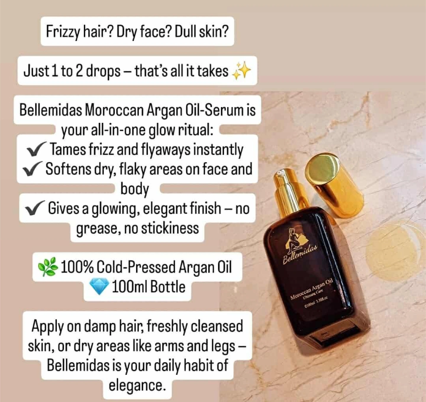 65This is Belledmida's Moroccan Argan Oil-Serum. It's your all-in-one glow ritual! It tames frizz and flyaways instantly and softens dry, flaky areas on face and body. It gives a glowing, elegant finish with no grease or stickiness. The bottle contains 100% Cold-Pressed Argan Oil and it's a 10ml bottle