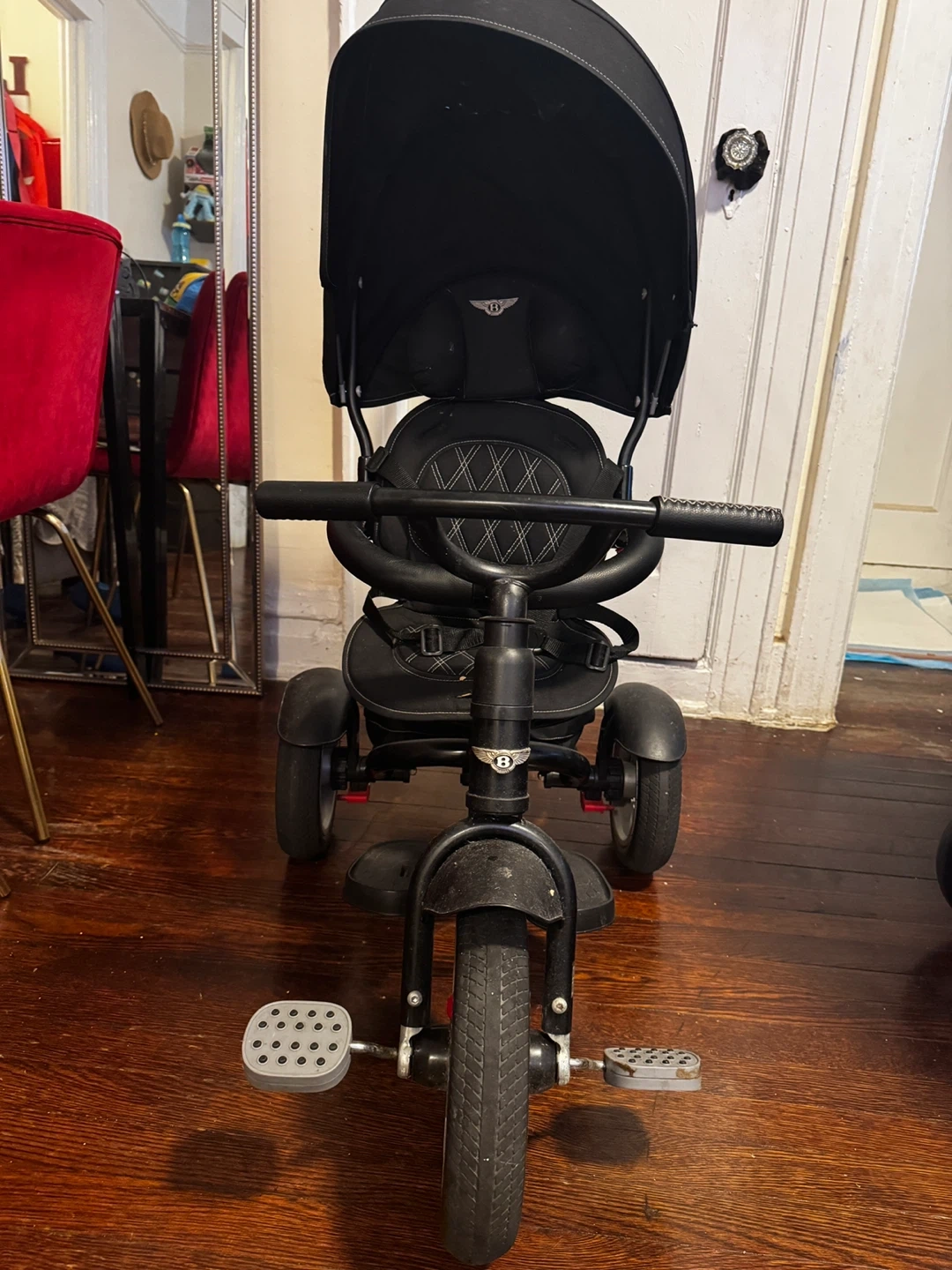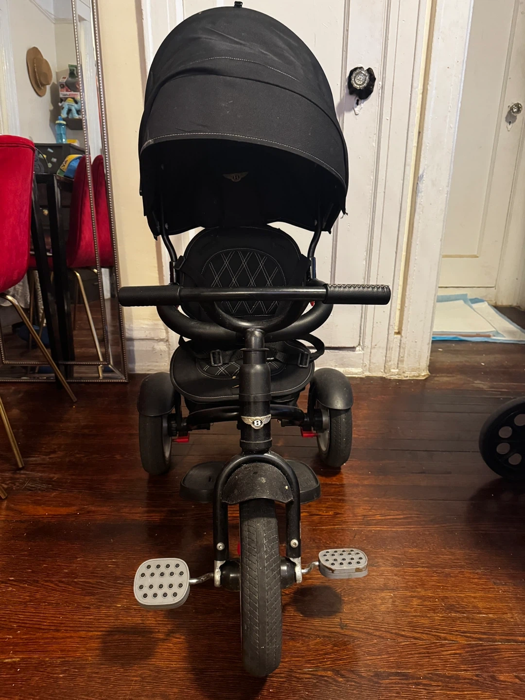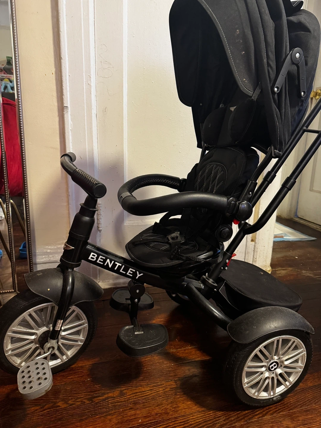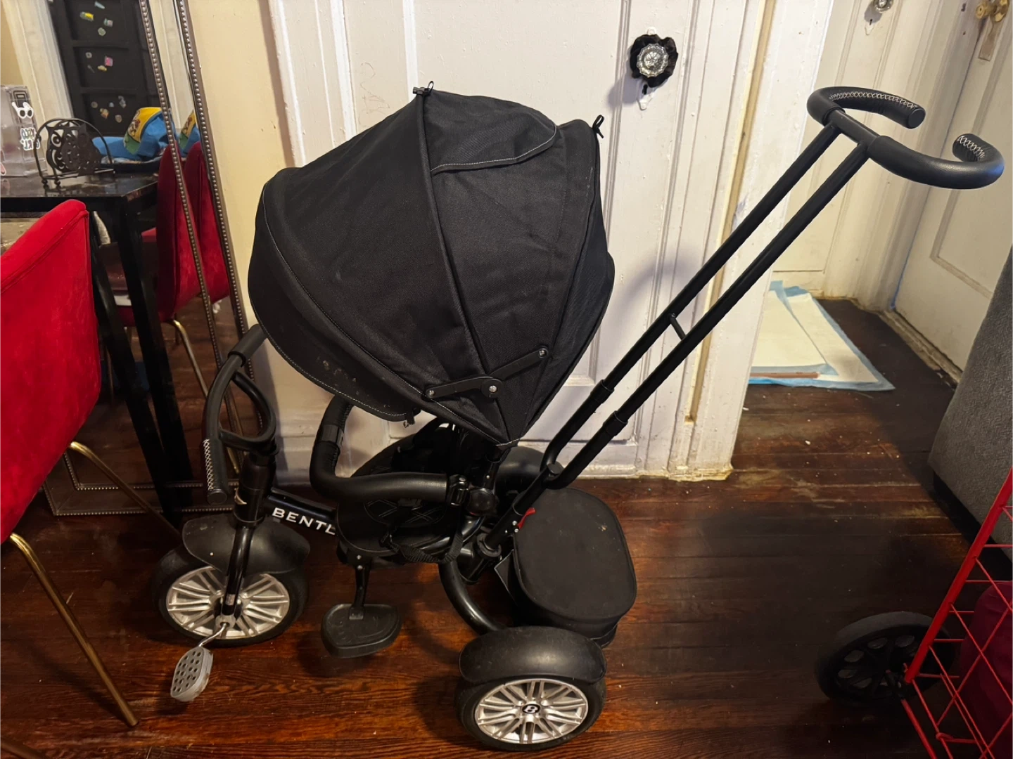 Selling a Bentley 6-in-1 stroller trike in black! It's in great condition and ready for a new home. This trike is designed to grow with your child, offering multiple stages of use. It combines the elegance of Bentley design with the practicality of a stroller and the fun of a trike