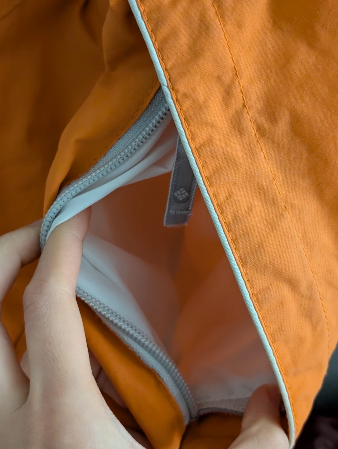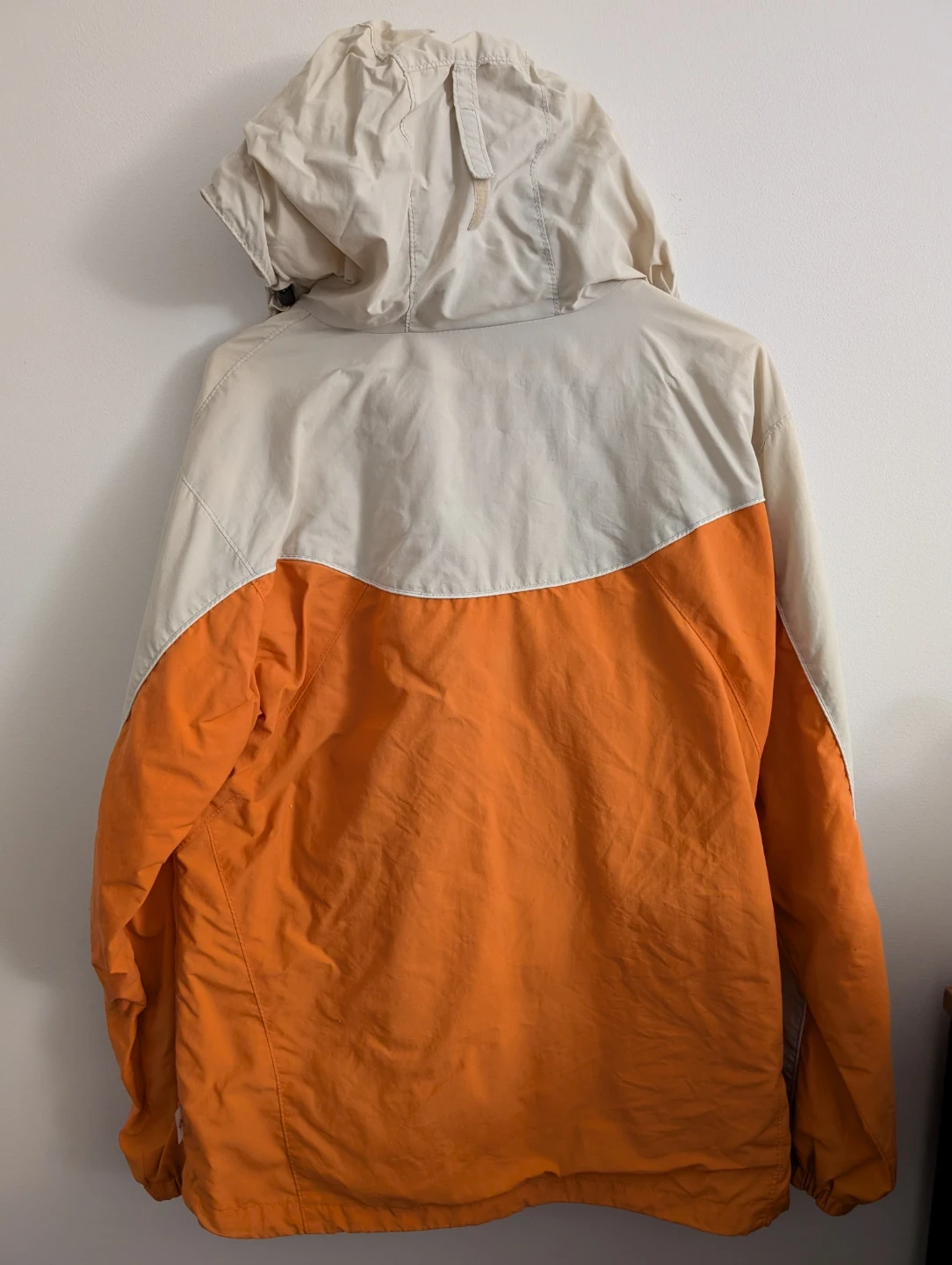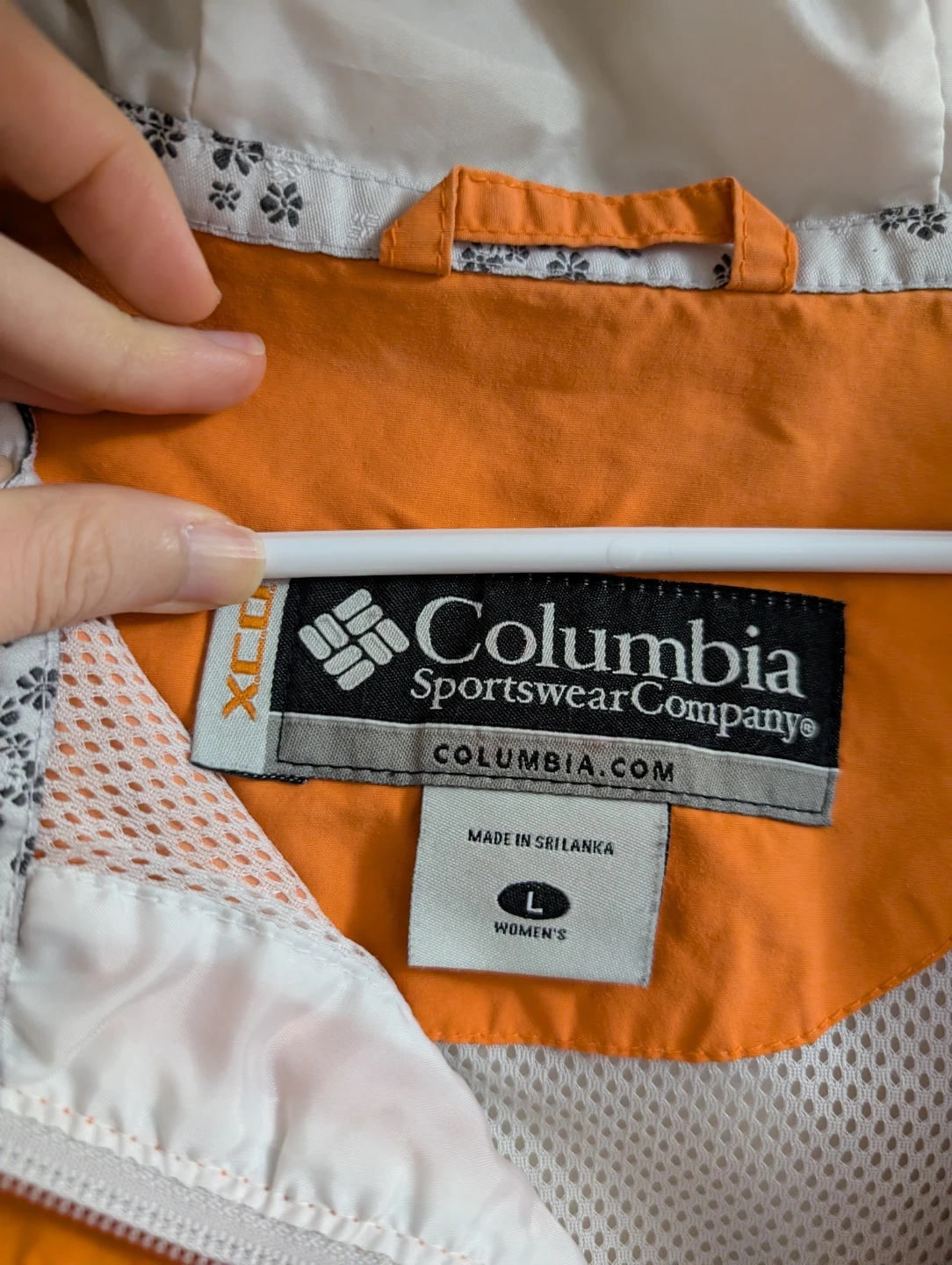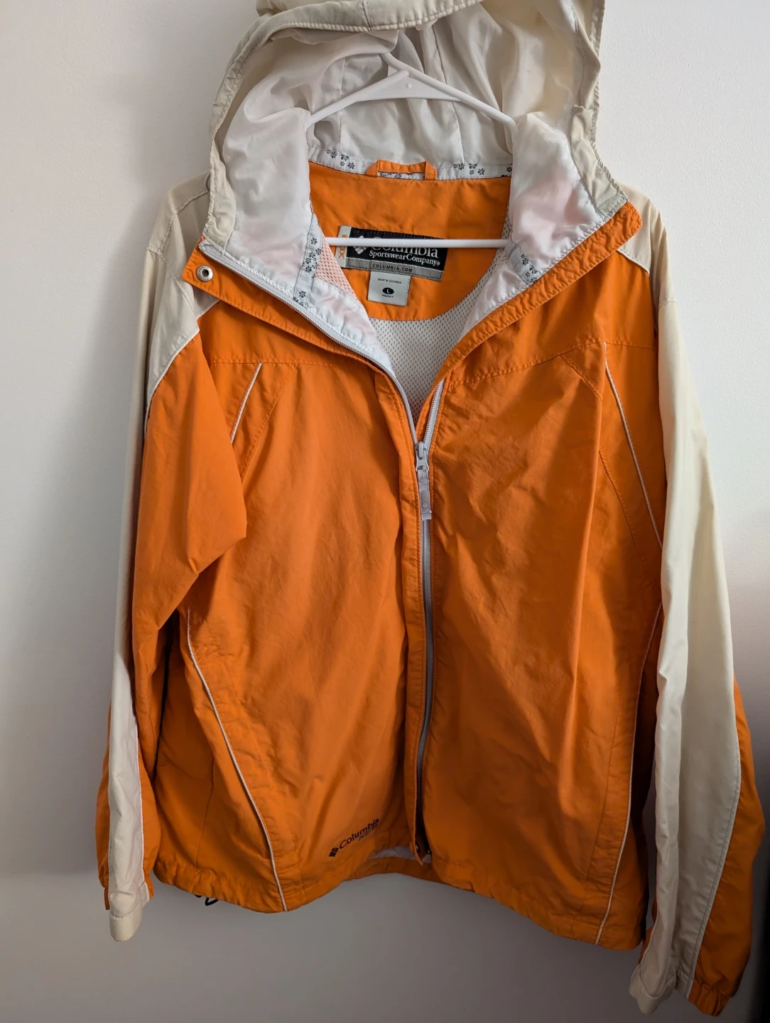 Columbia Sportswear Company hooded jacket in orange and cream. Made in Sri Lanka. Women's size large. It's a lightweight, sporty jacket.