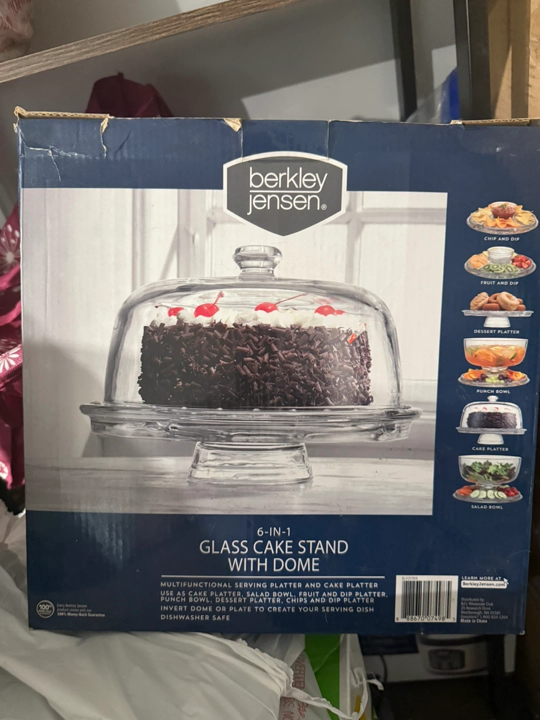 65Selling a Berkley Jensen 6-in-1 glass cake stand with a dome! It's a multifunctional serving platter and cake platter. You can use it as a cake platter, salad bowl, fruit and dip platter, punch bowl, dessert platter, or chips and dip platter. You can also invert the dome or plate to create your serving dish. It's also dishwasher safe!