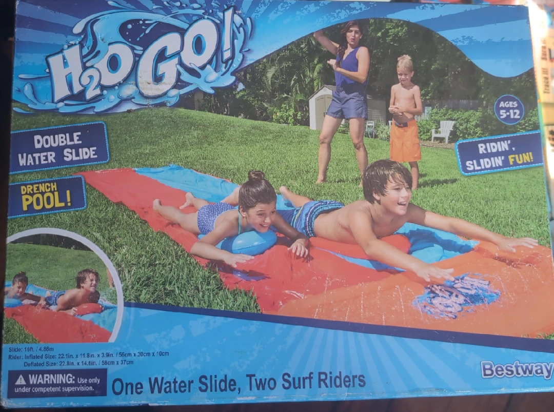 15Get ready for some summer fun with this Bestway H2OGO! Double Water Slide! It's perfect for kids aged 5-12. - Double Water Slide - Inflated Rider Size: 22.1in x 11.8in x 3.9in / 56cm x 30cm x 10cm - Deflated Size: 22.8in x 14.6in / 58cm x 37cm - Slide Length: 16ft / 4.88m Ridin', Slidin' Fun!