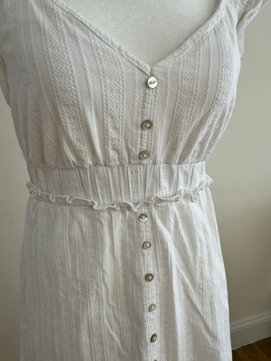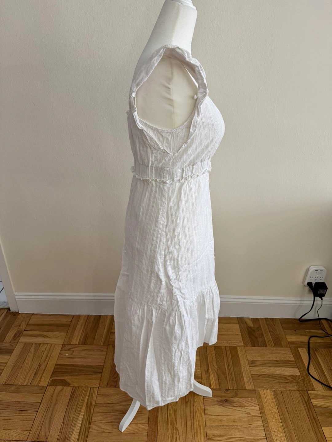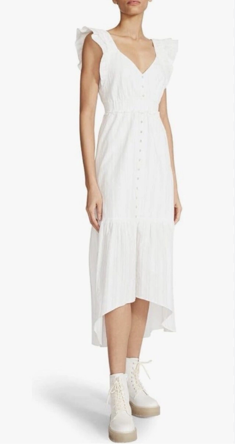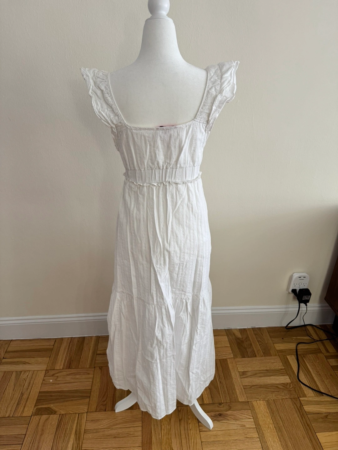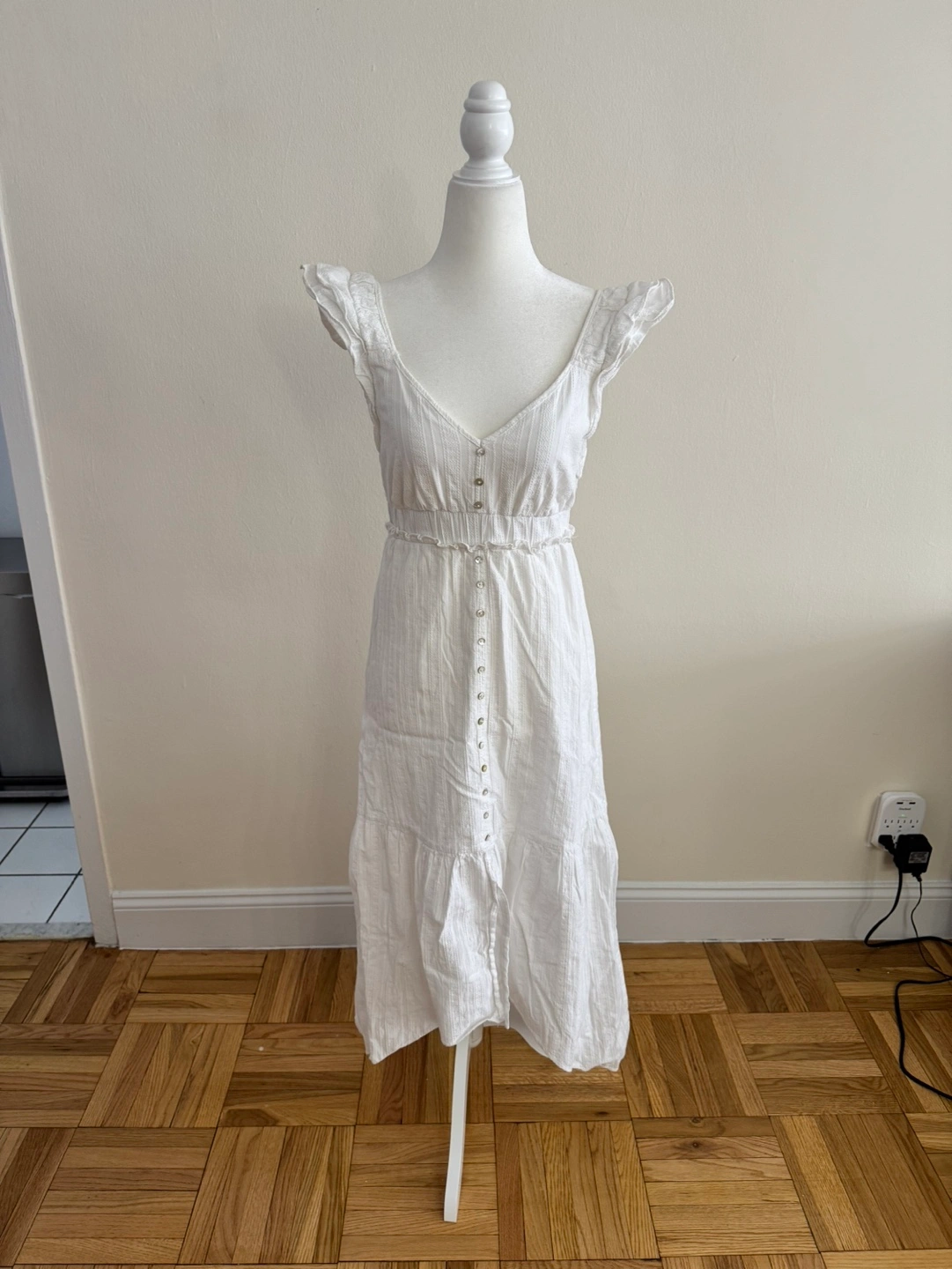 White eyelet midi dress. Features ruffle sleeves and a button-down front. High-low hemline. Relaxed fit. Runs small especially in the bust. Closer to an XS. Pickup is on 72nd and 1st in Manhattan. Preference given to whoever schedules pickup first.