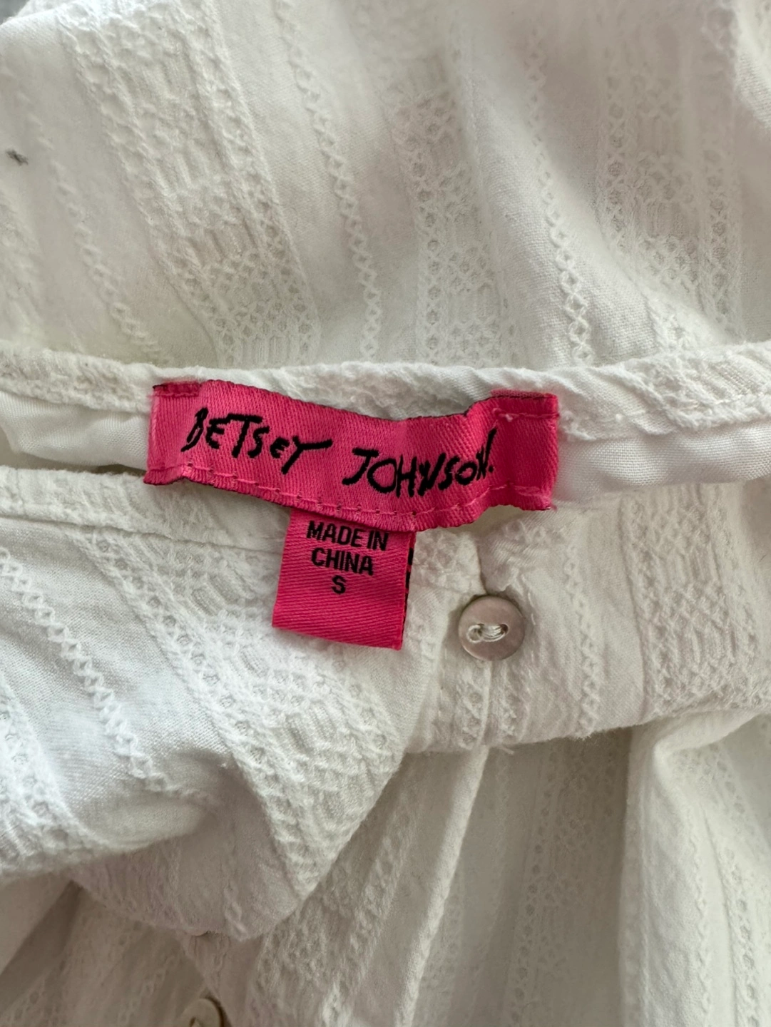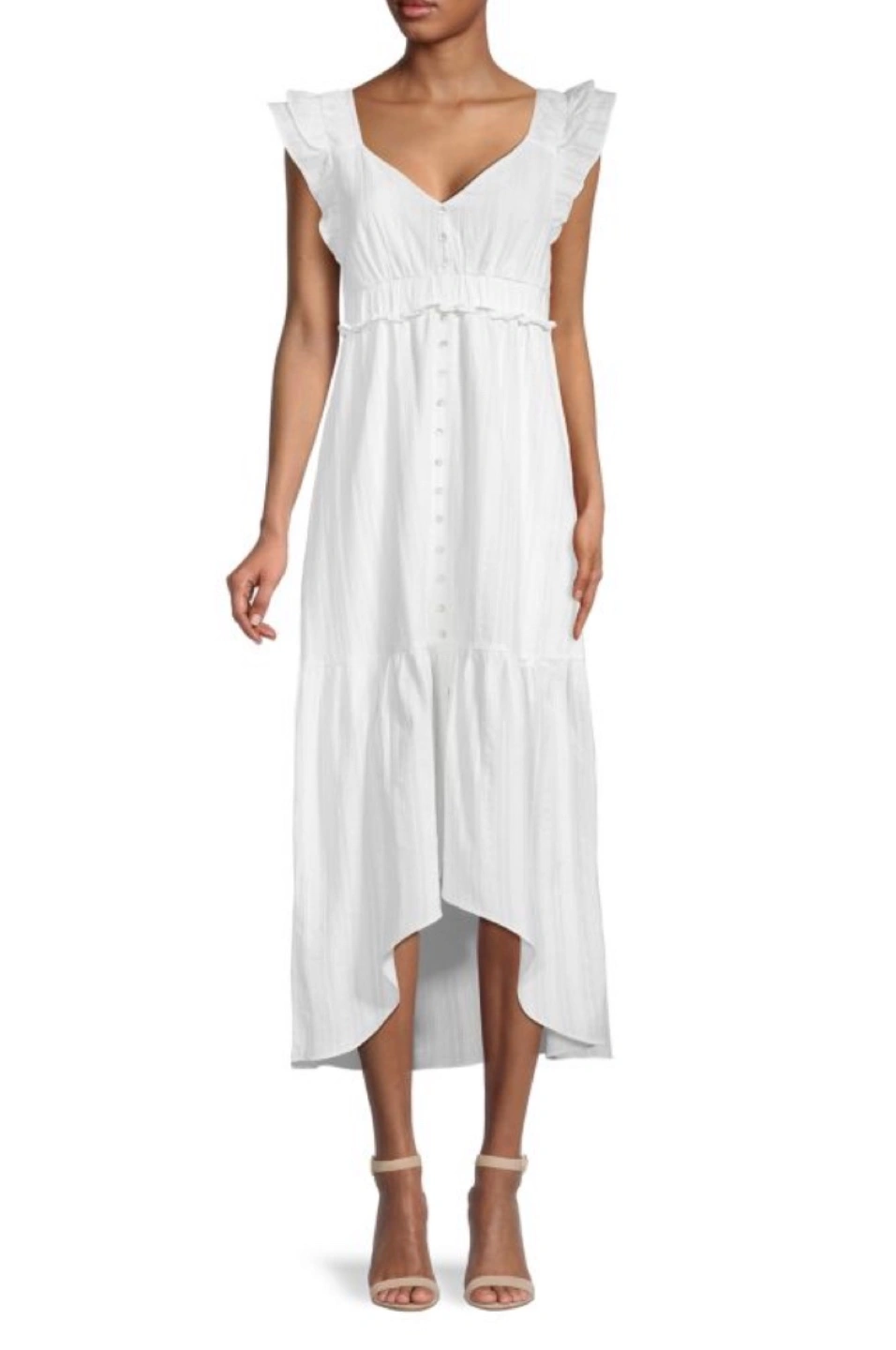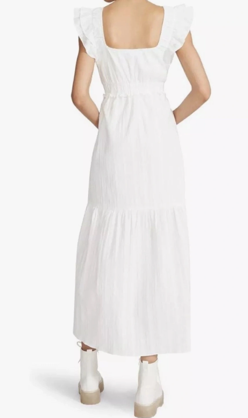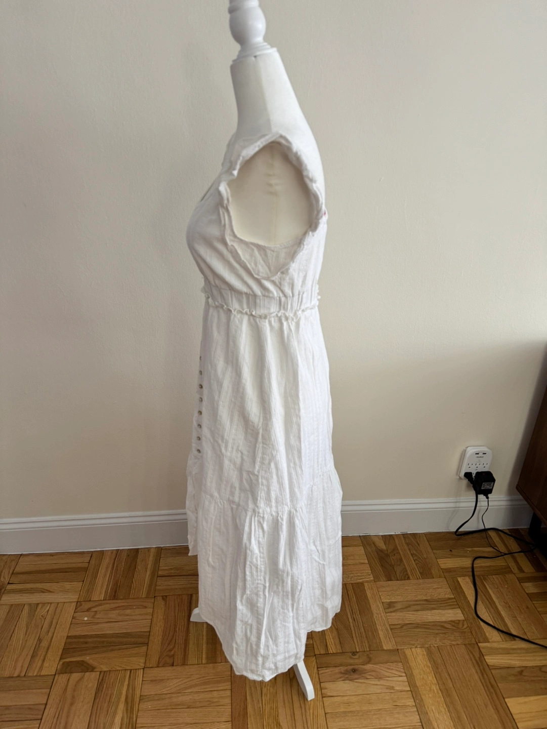 White eyelet midi dress. Features ruffle sleeves and a button-down front. High-low hemline. Relaxed fit. Runs small especially in the bust. Closer to an XS. Pickup is on 72nd and 1st in Manhattan. Preference given to whoever schedules pickup first.