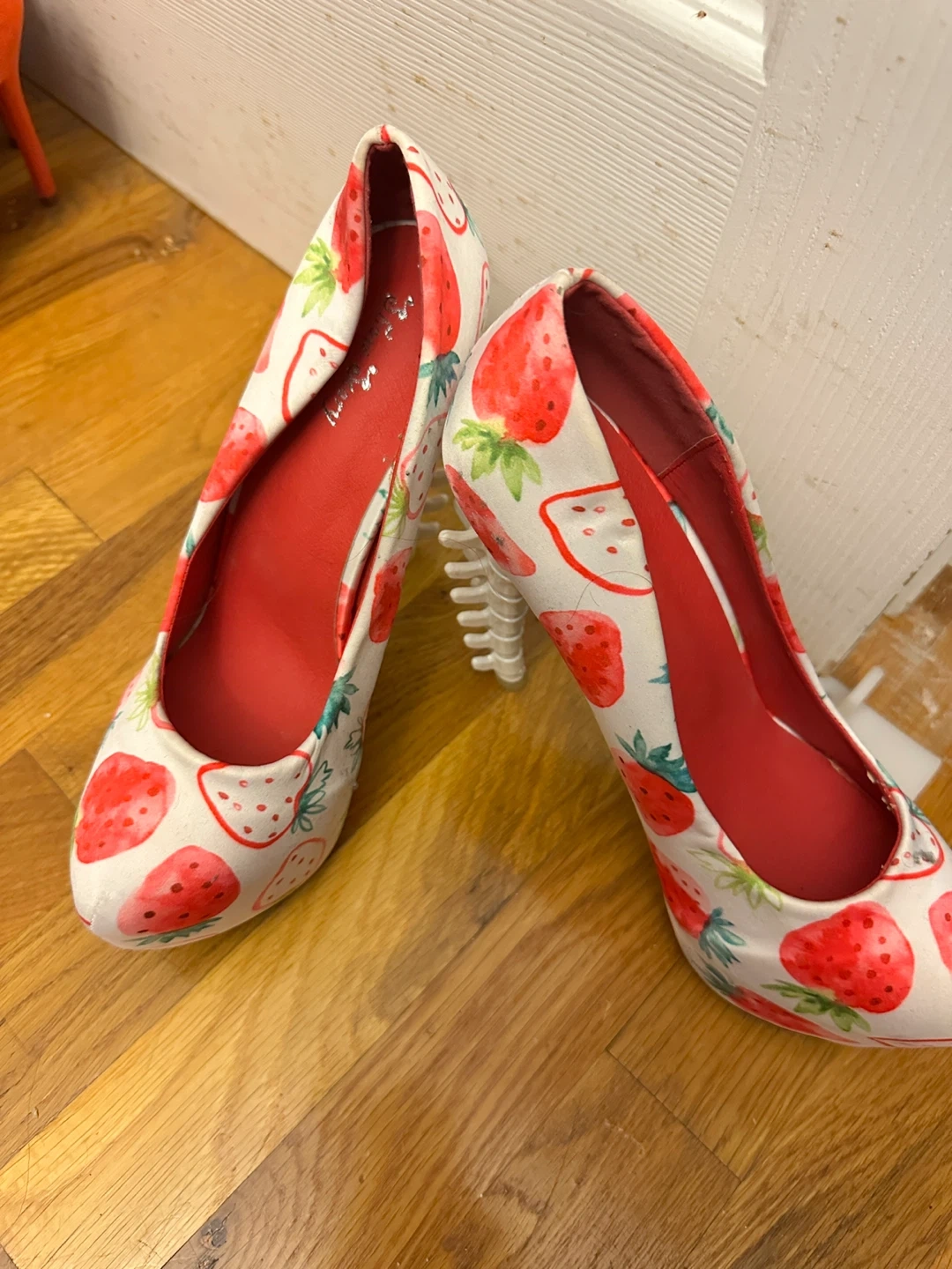 Adorable Betsey Johnson heels with a strawberry print! These are sure to make a statement. The insole is red, and the heel is a unique, eye-catching design