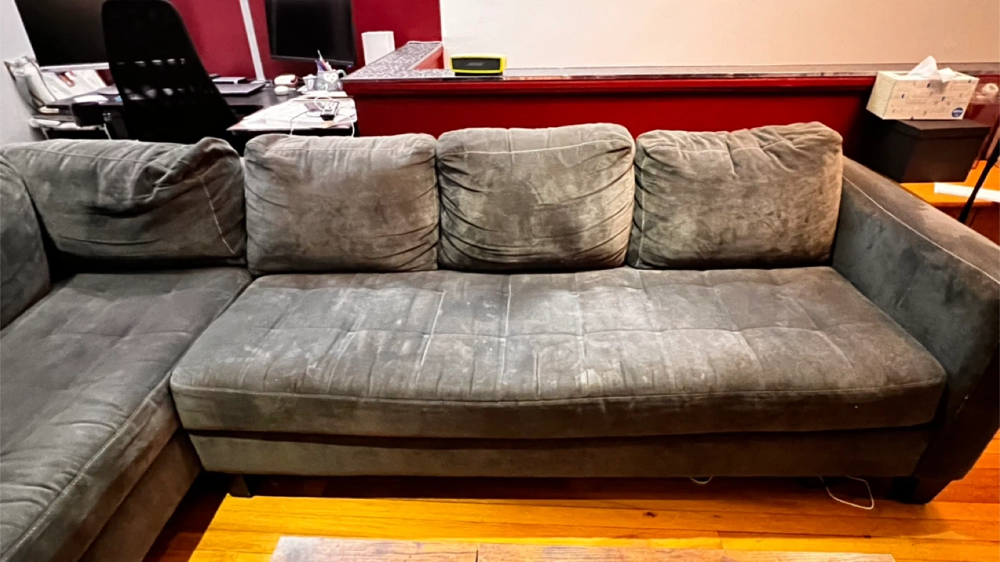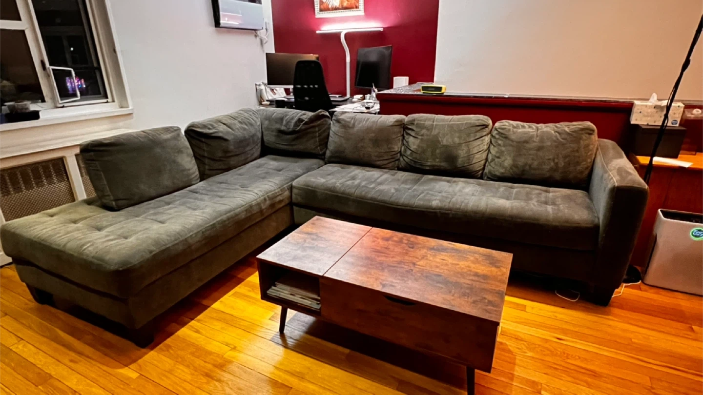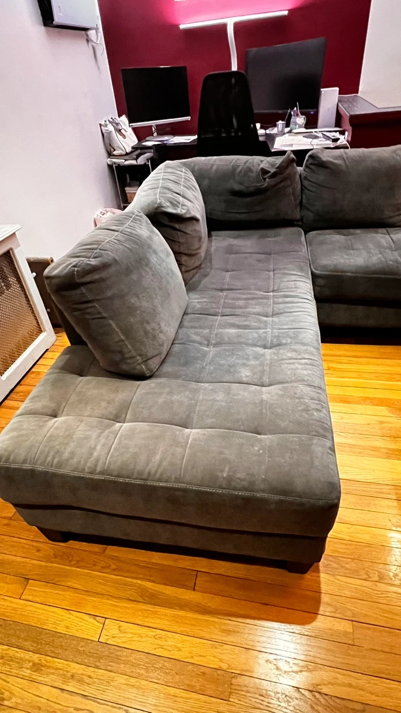 Selling a comfortable microfiber charcoal gray sectional sofa. It's a Macy’s furniture, in great condition and ready for a new home. Perfect for an entertainment room, lounging and relaxing!