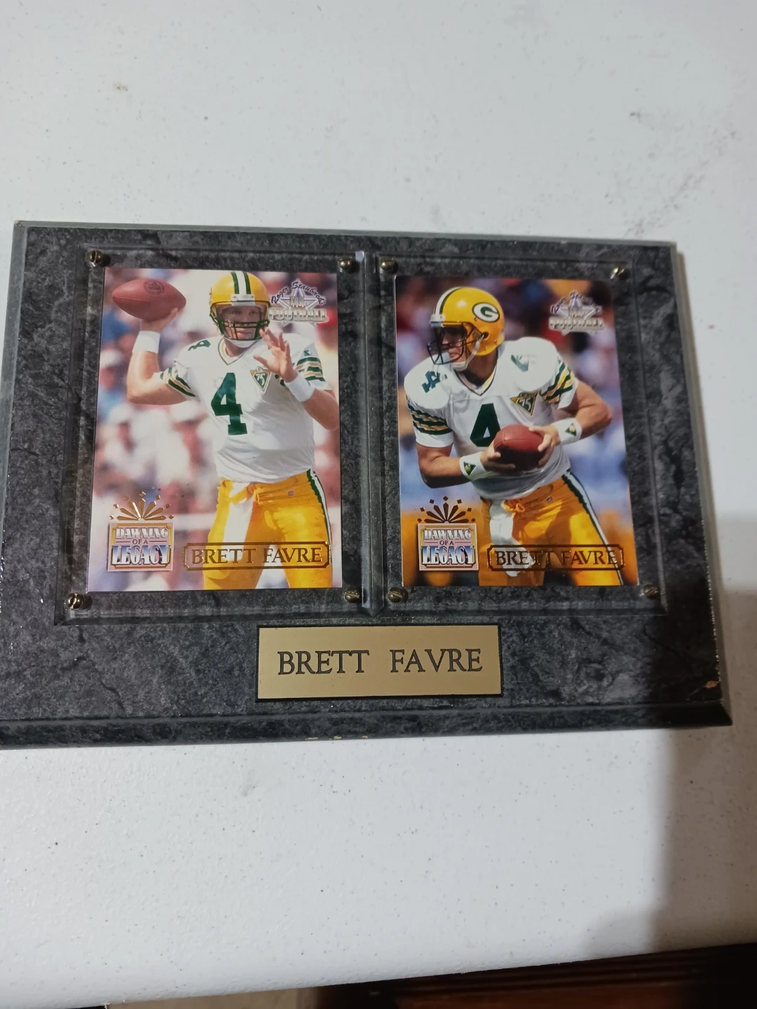 This display features two football cards of Brett Favre. Both cards are labeled "Dawning of a Legacy" and showcase Favre in his Green Bay Packers uniform. A metal plate at the bottom reads "BRETT FAVRE". I only do pickup
