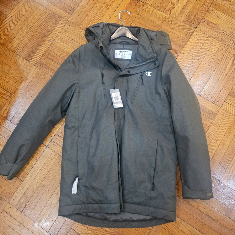 Selling a Champion hooded jacket in a nice olive green color. brand new and ready to keep you warm! It features a hood and a comfortable fit.