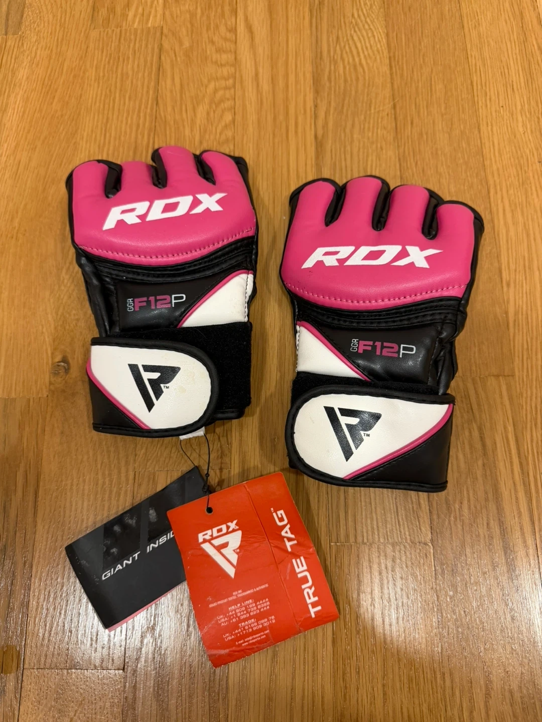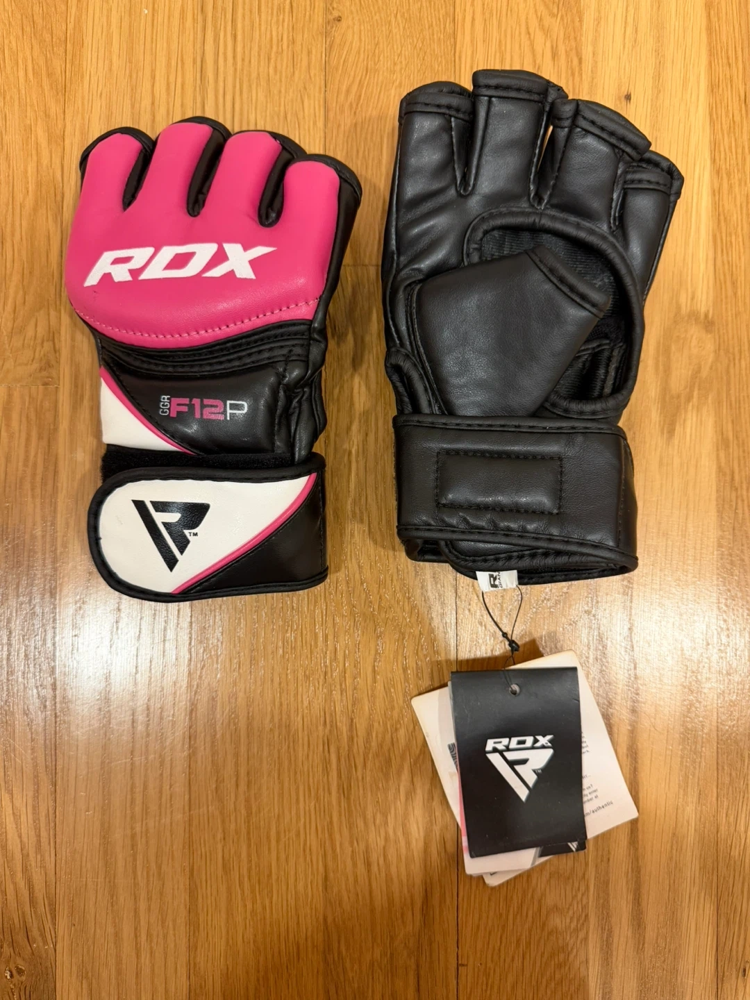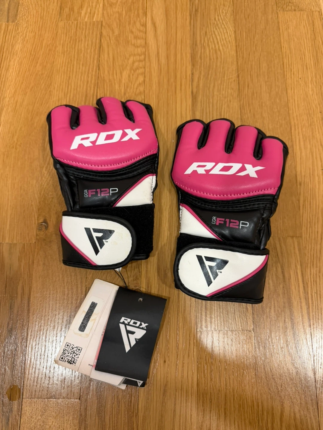 RDX MMA gloves in pink and black in size small! These gloves are new with tags and ready for your next training session. They feature the RDX logo and a comfortable design for grappling and striking!