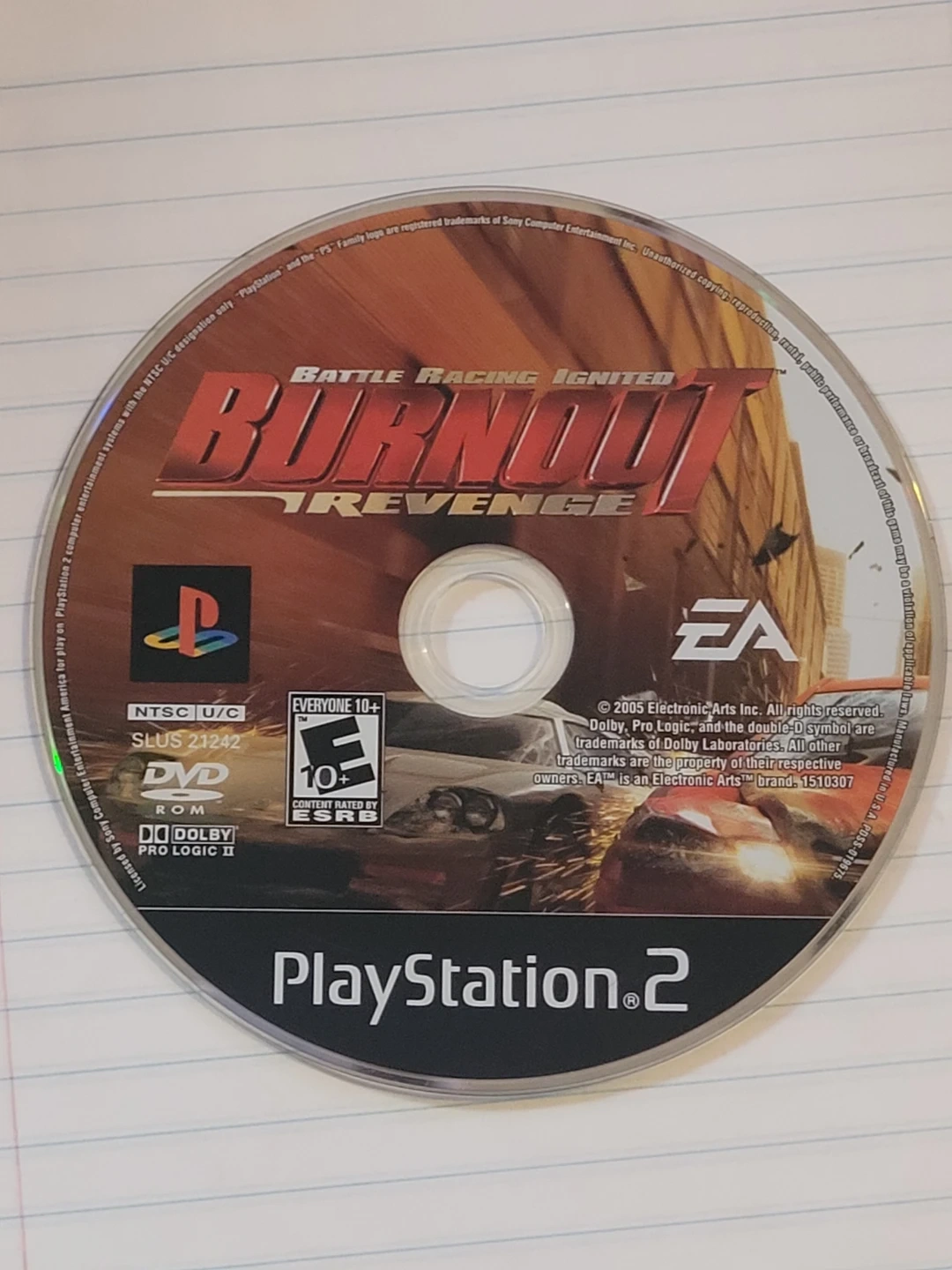 This is the Burnout Revenge game disc for PlayStation 2. It's rated E for Everyone 10+ by ESRB. The disc is for NTSC U/C regions.