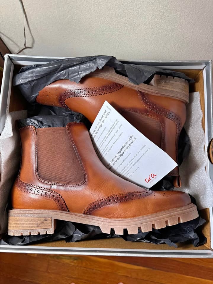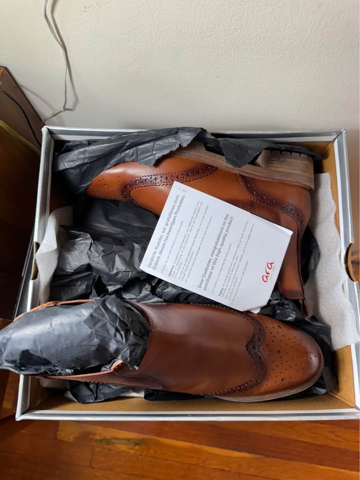 They are brand new, ARA German brand known for its quality. The boots are made in India. They are leather and Women Size 9.5 or EU 40. My wife bought them in Germany and now has changed her mind. Originally paid $144.