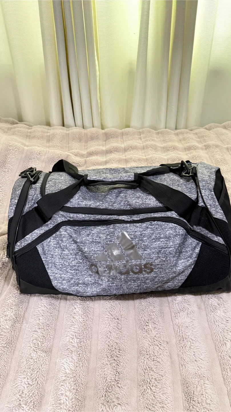 This is an Adidas duffel bag in gray. It's a versatile bag for gym or travel. Features multiple compartments and adjustable strap.